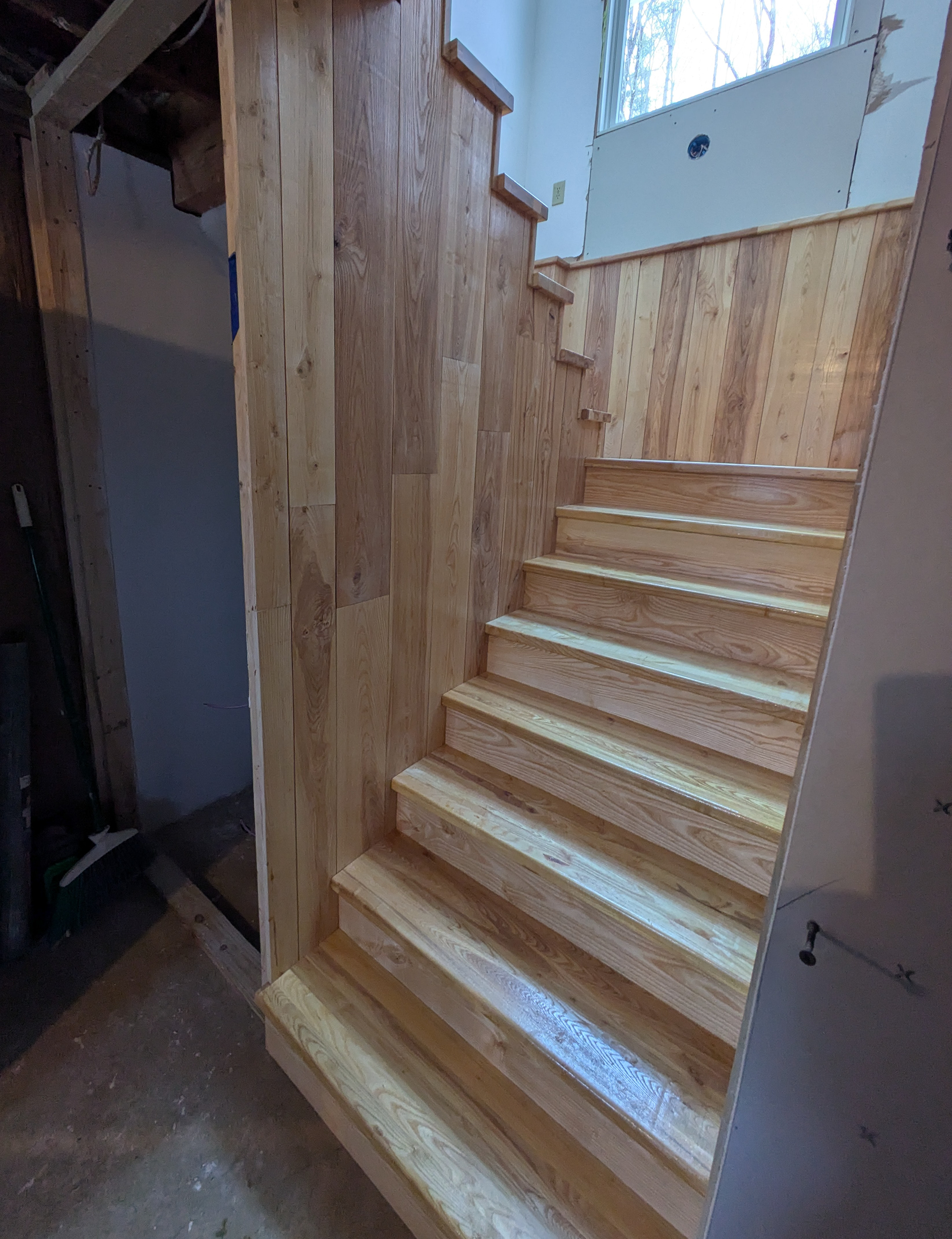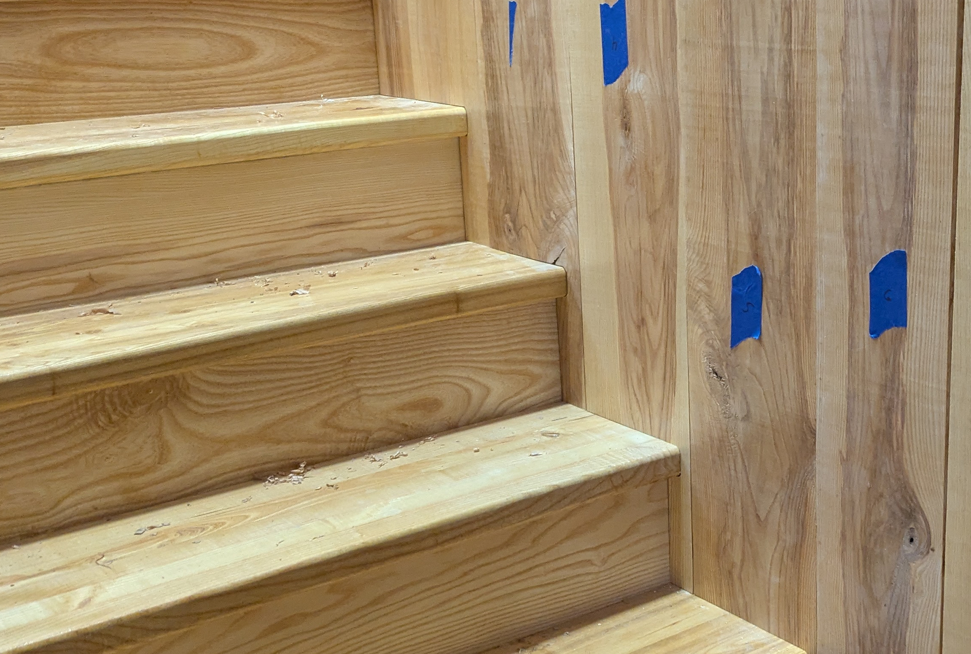 My crew of (2 carpenters, and myself) recently built a set of stairs with a landing and ship-lap wall cladding. All of the mill work was built from ash and was provided to us pre-finished with polyurethane.