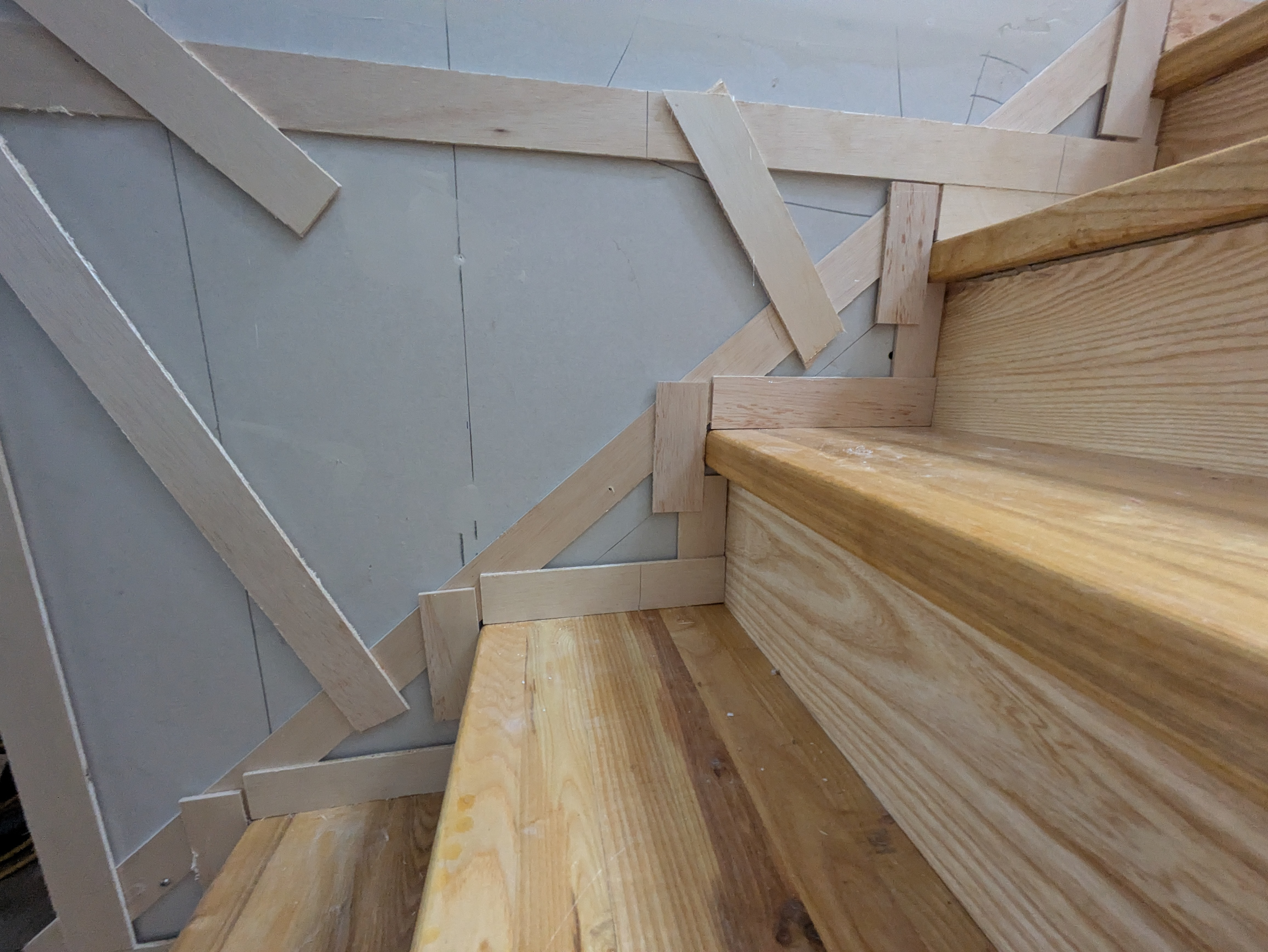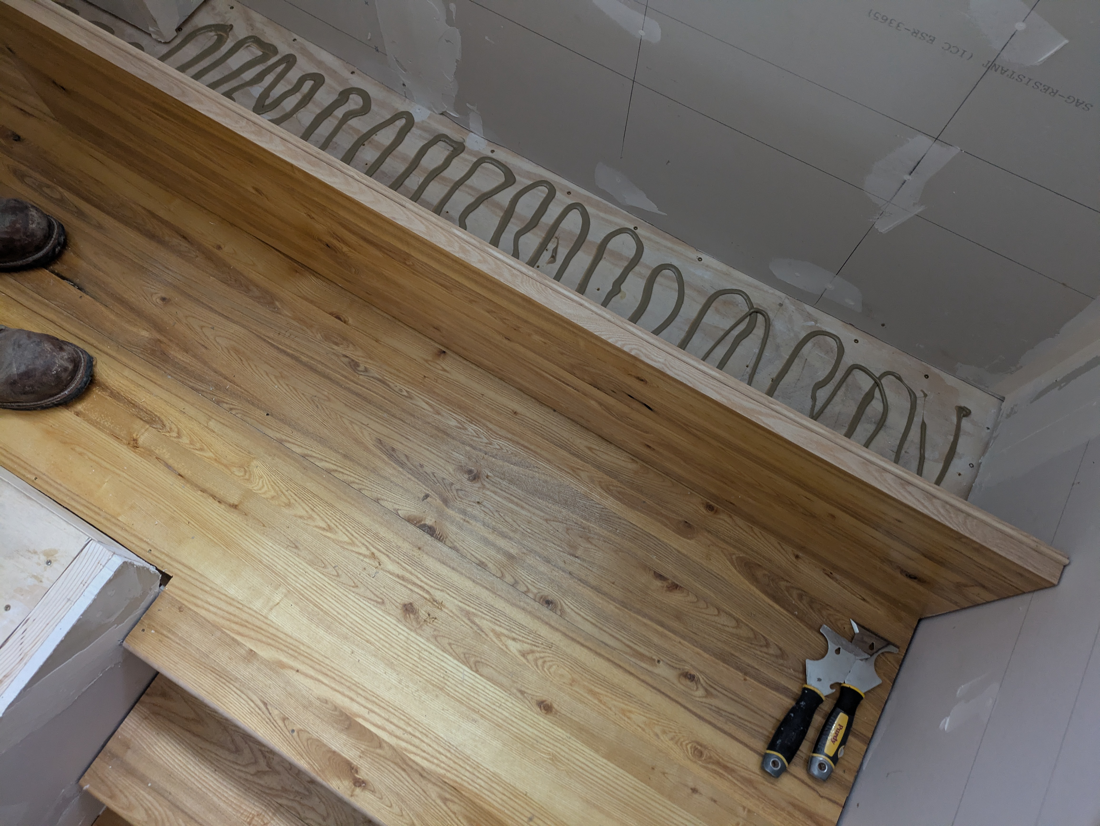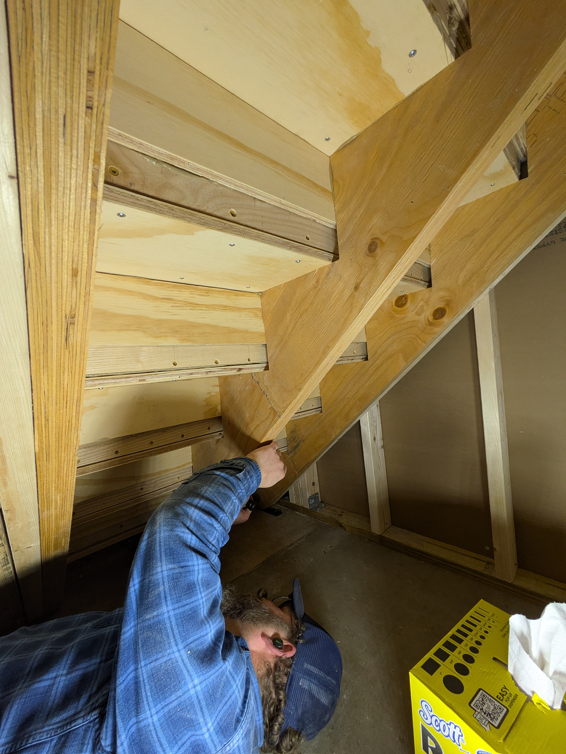 Krestia pre-assembles the treads and risers in pairs using pocket screws and PL Premium construction adhesive. Square-cut pieces of framing lumber are screwed to the back side of the sub-assemblies to hold them square as the adhesive cures. While this work is proceeding, our coworker Ken is adding blocking to the walls to support the ship lap. He is also putting back up and taping the sheetrock.