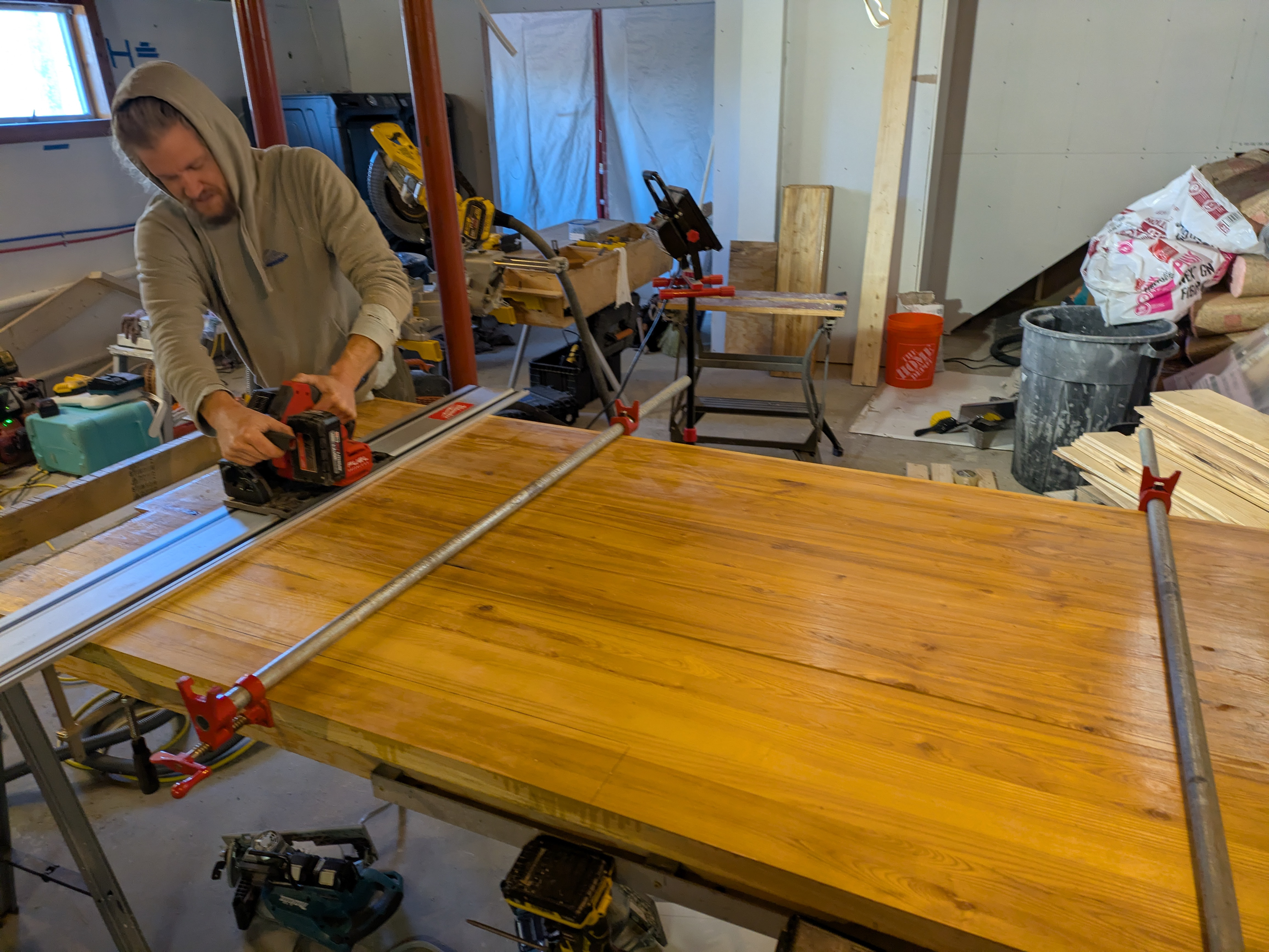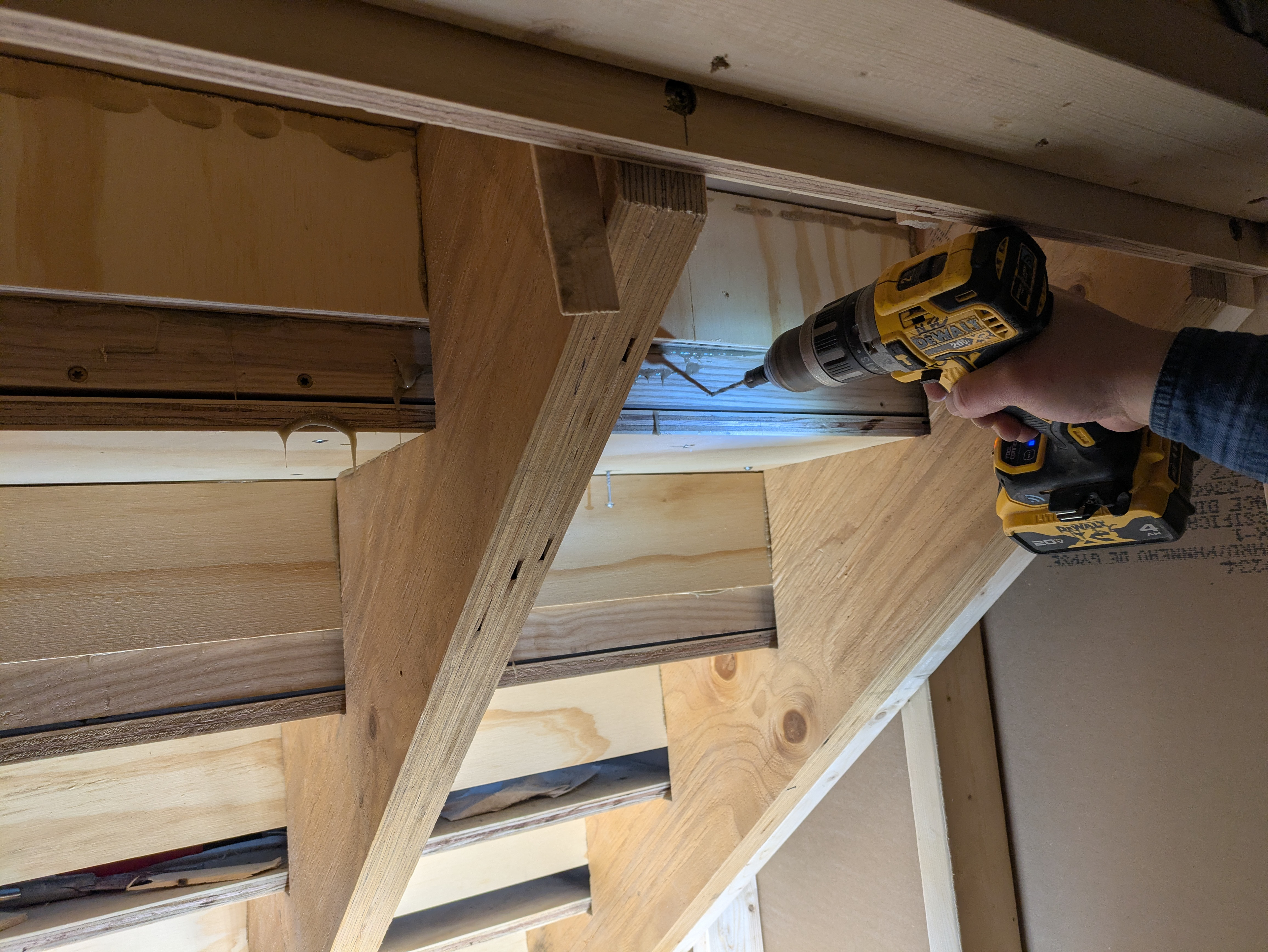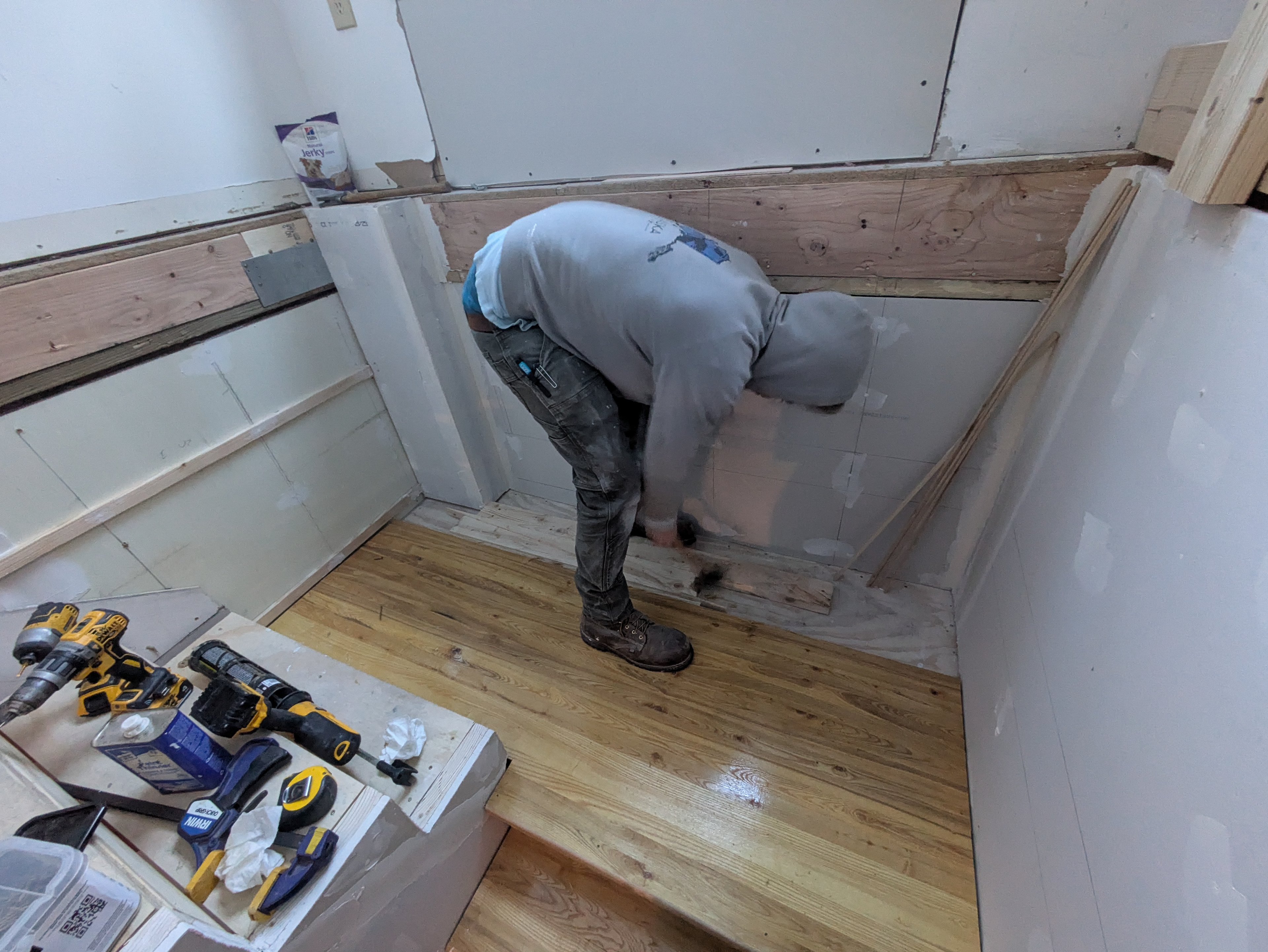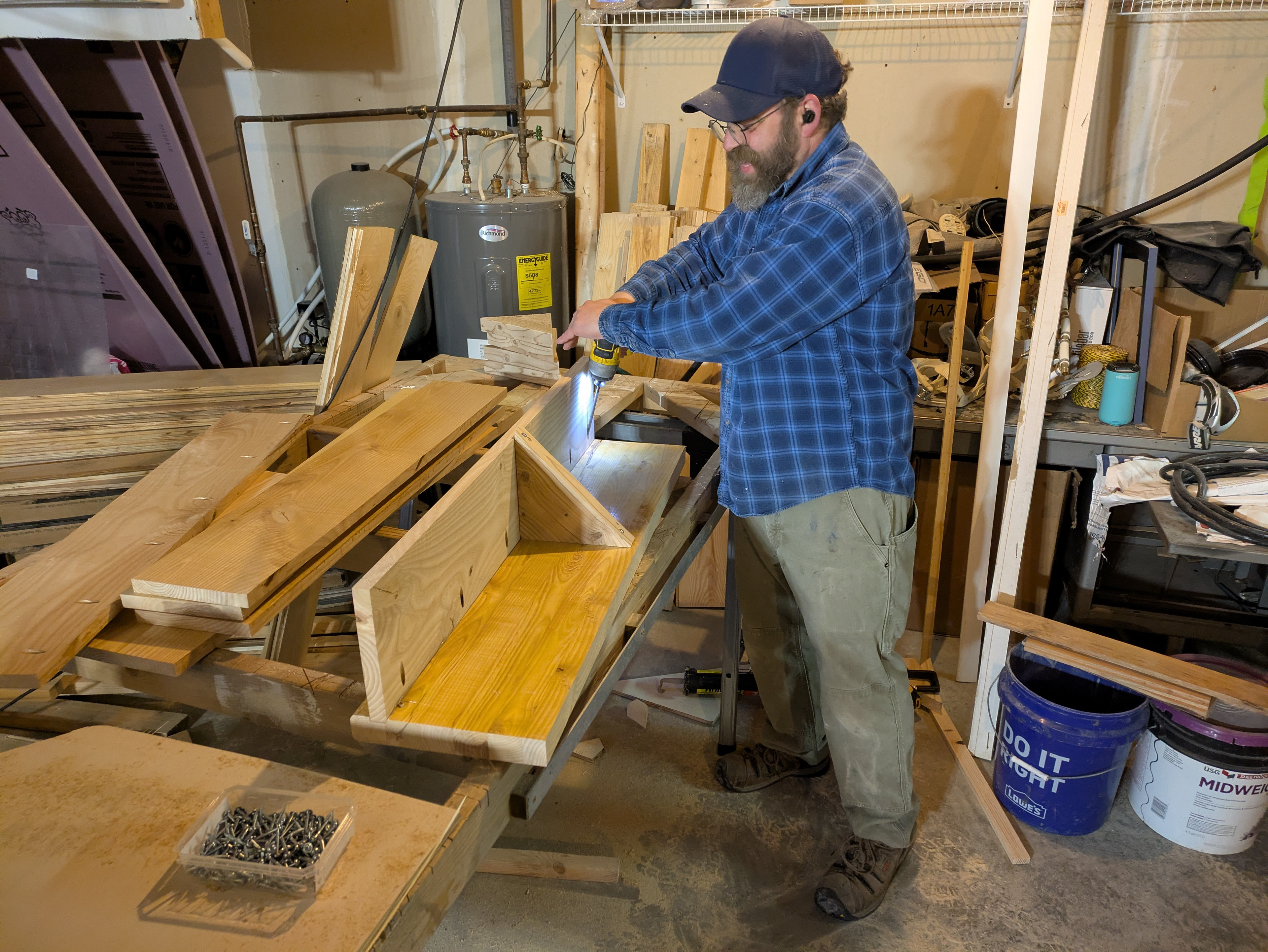Krestia pre-assembles the treads and risers in pairs using pocket screws and PL Premium construction adhesive. Square-cut pieces of framing lumber are screwed to the back side of the sub-assemblies to hold them square as the adhesive cures. While this work is proceeding, our coworker Ken is adding blocking to the walls to support the ship lap. He is also putting back up and taping the sheetrock.
