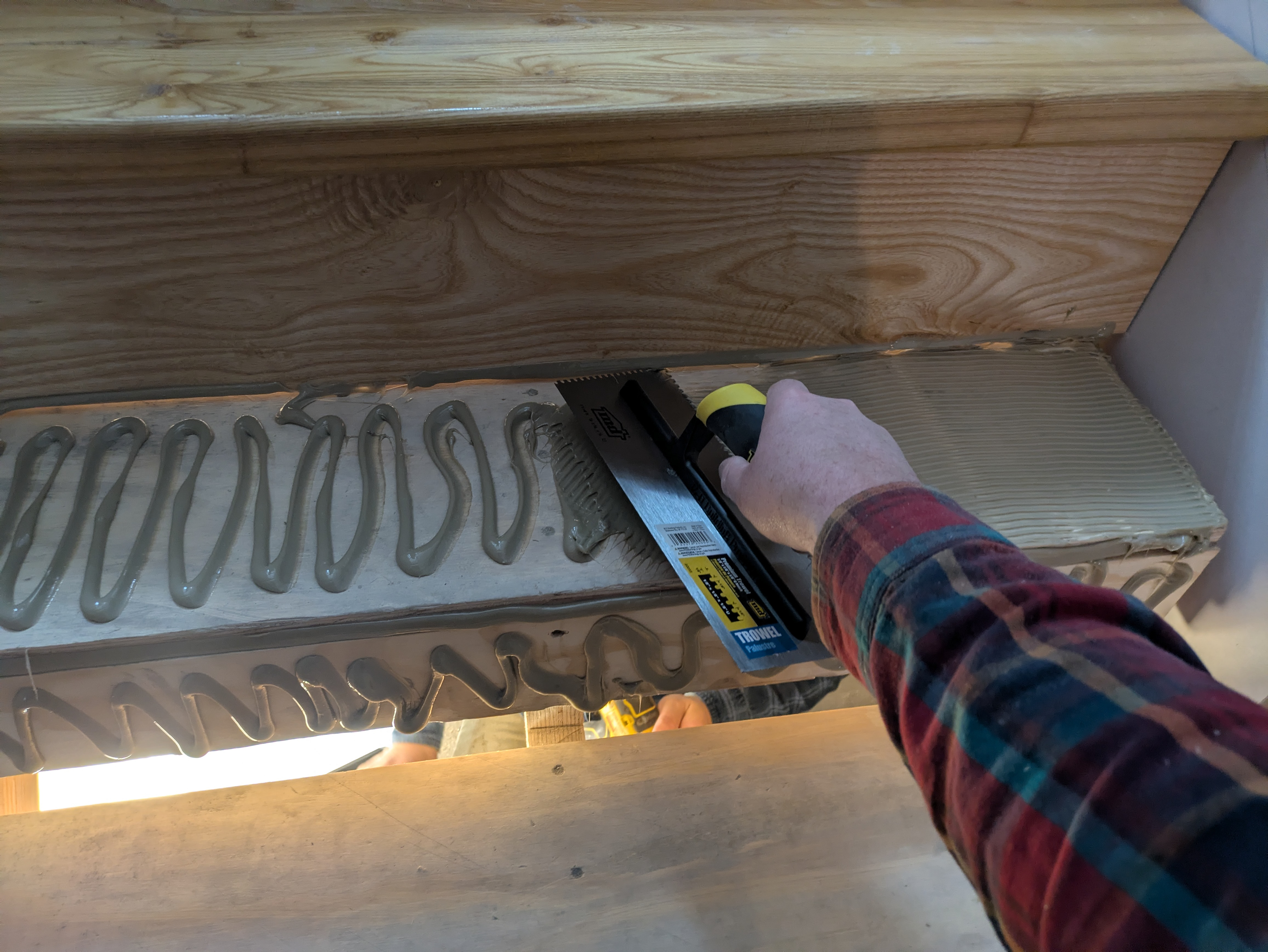 Installing the tread and riser sub-assemblies is straightforward. We start at the top and work our way down. In this case, we are starting with the lower flight of stairs. The top tread is preassembled to both the riser above and the riser below then fastened to the sub-tread from below with course-thread pocket screws. We will install the landing tread later. Most of the remaining treads and risers are installed in their preassembled pairs. I use an electric caulk gun to apply the PL then spread it out with a notched trowel. I leave a bead of PL on the face of the riser where it will contact the tread below.