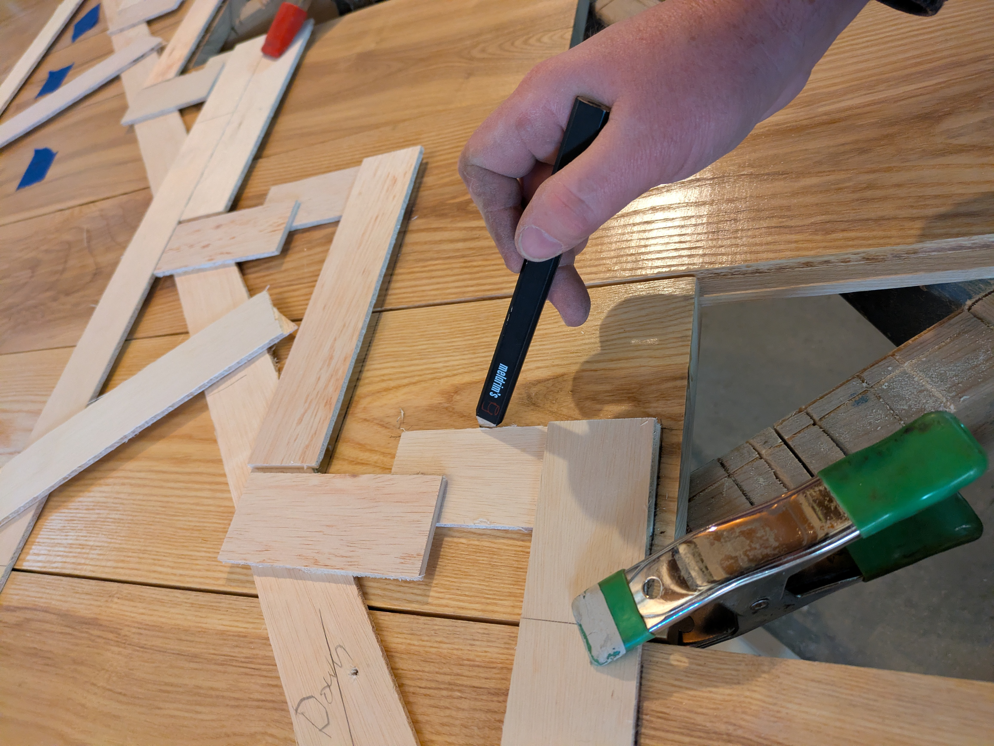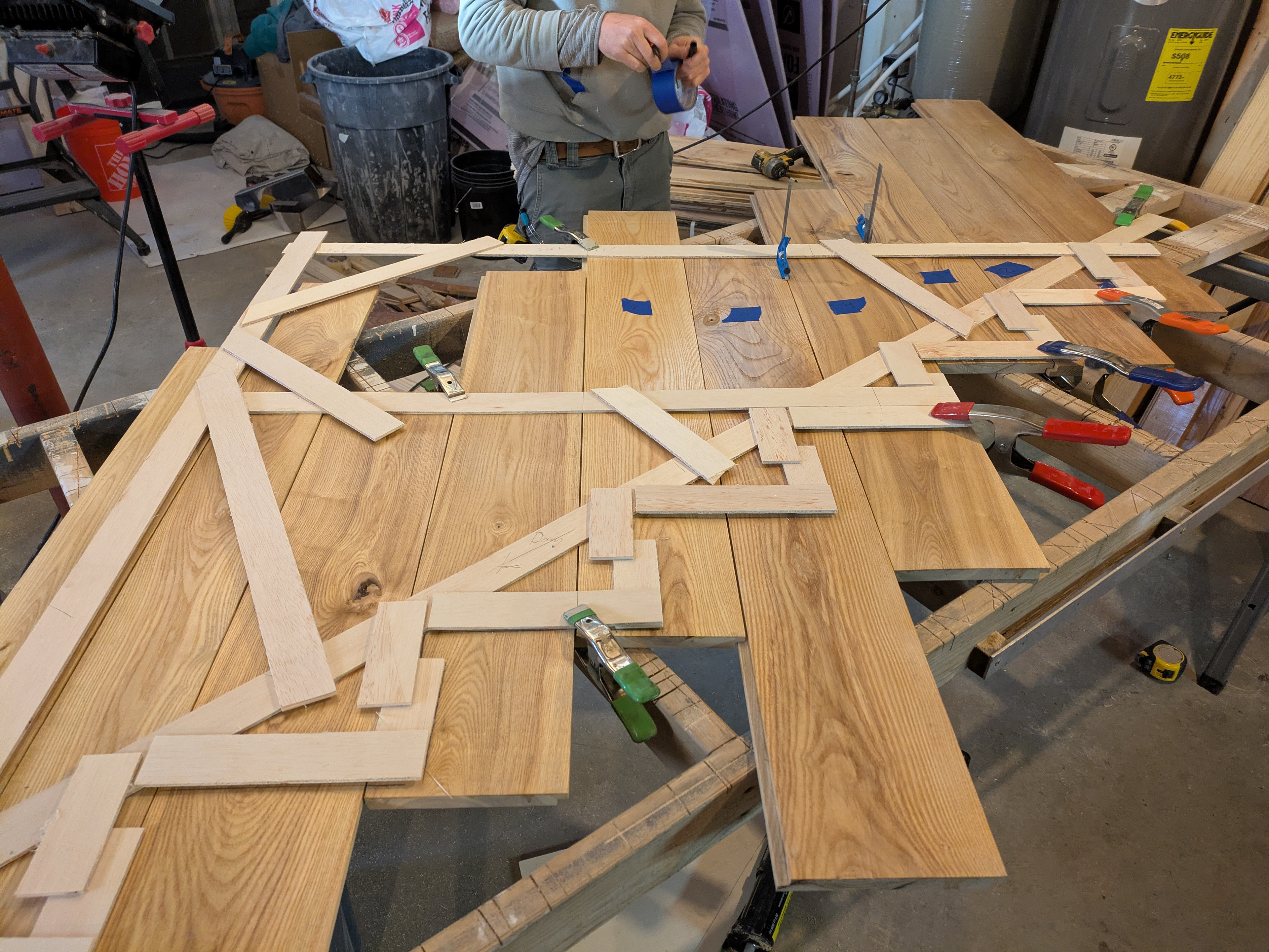 Meanwhile, Ken has grooved, splined and dry-fit 3 massive ash butcher-block slabs together. He templated the landing with a hot glue gun and strips of luan in order to accurately layout the cuts.