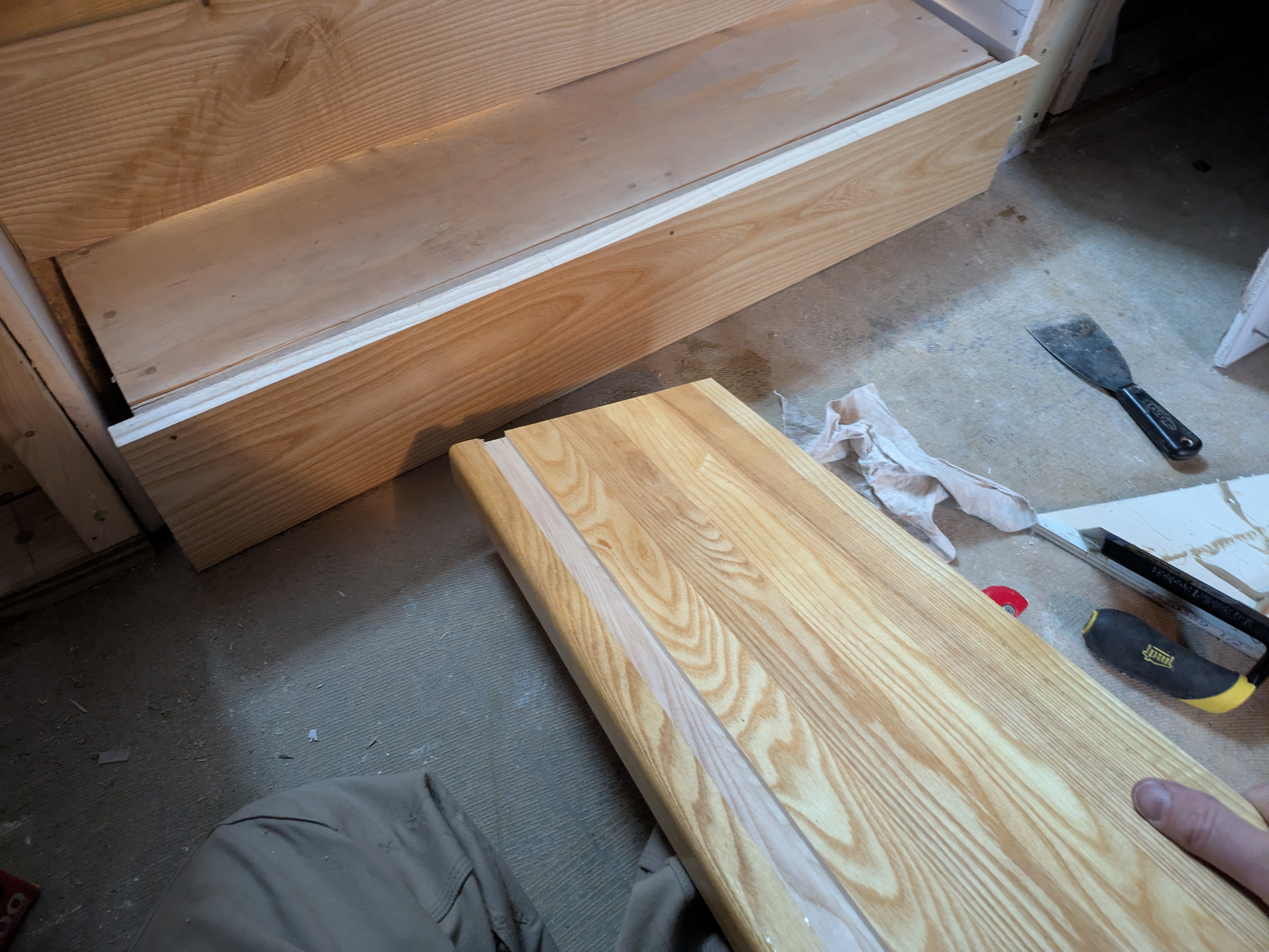 We installed a landing tread around the stairwell opening in preparation for the tile-setter who will be coming in after us.
