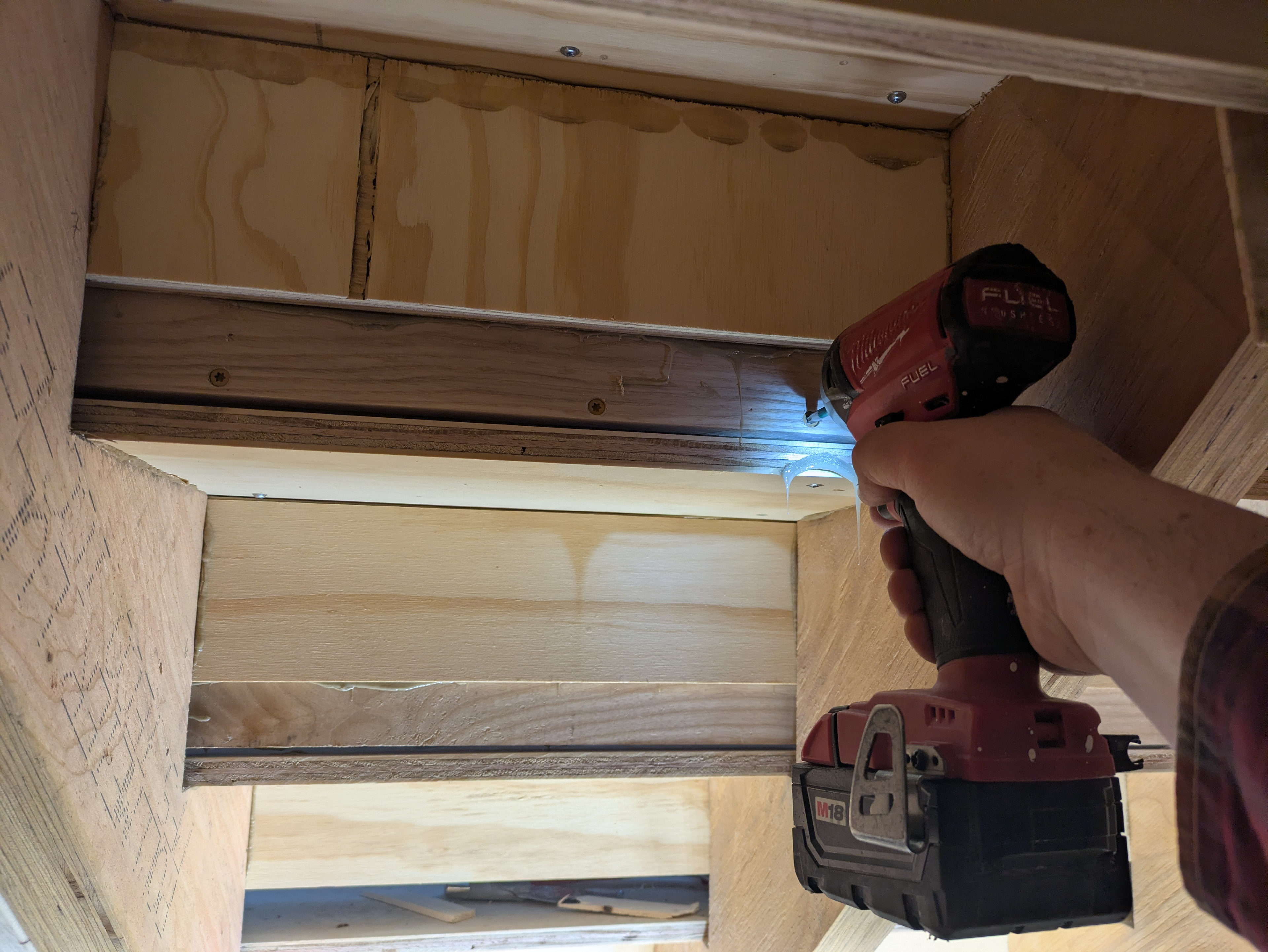 From under the stairs, Krestia is pre-drilling through the back of the riser. This will allow him to fasten the riser above to the back edge of the tread below which creates a seamless joint. The guys at Piha Construction kindly left a 2” space between the bottom edge of the sub-risers and the sub-tread below for this purpose.
