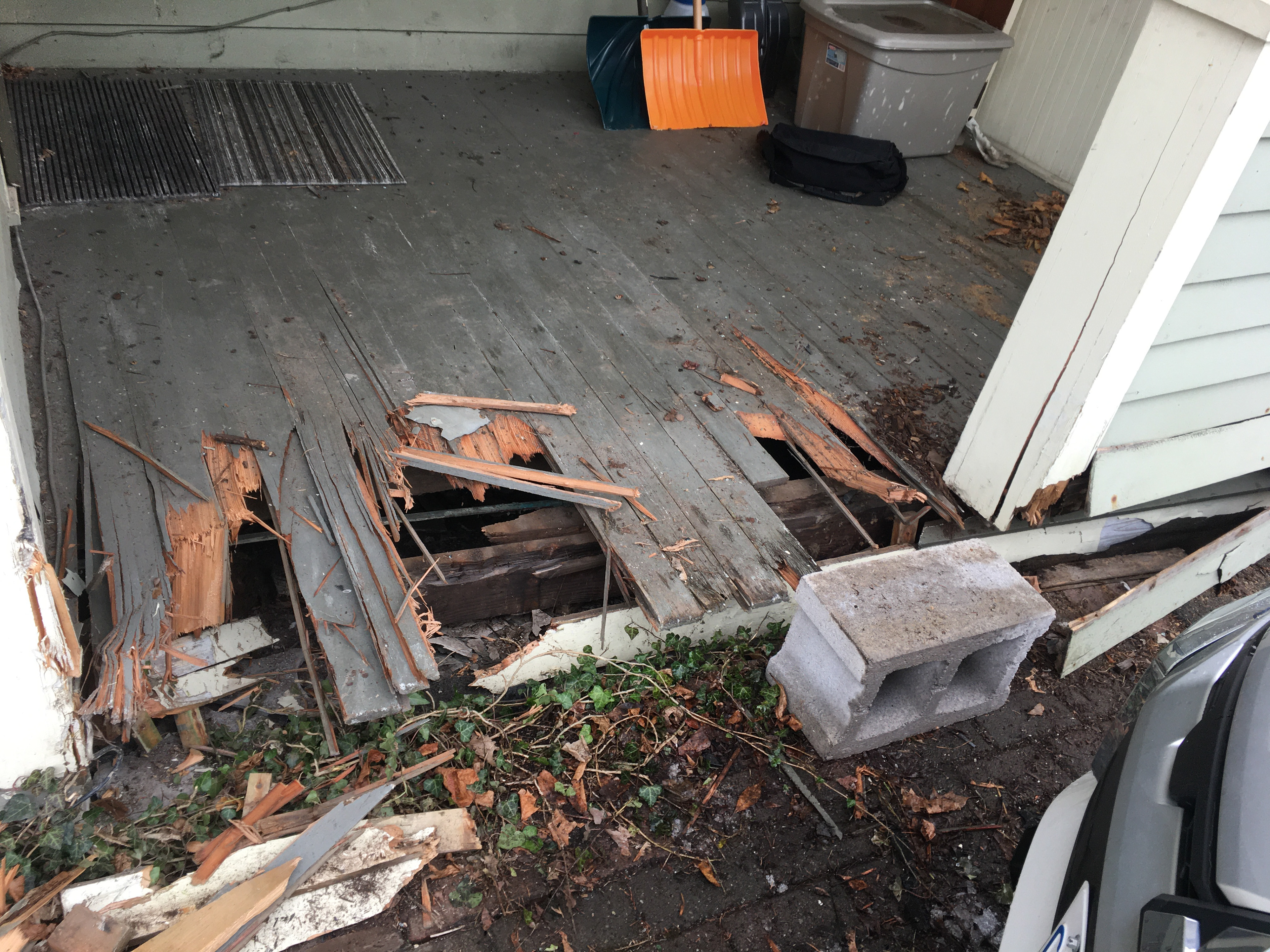 A car ran into this beautiful Craftsman style West Hill home in Ithaca. The porch sustained serious damage. My helper and I jacked the roof back into position, held it in place with some posts and rebuilt the porch. With Areti Construction