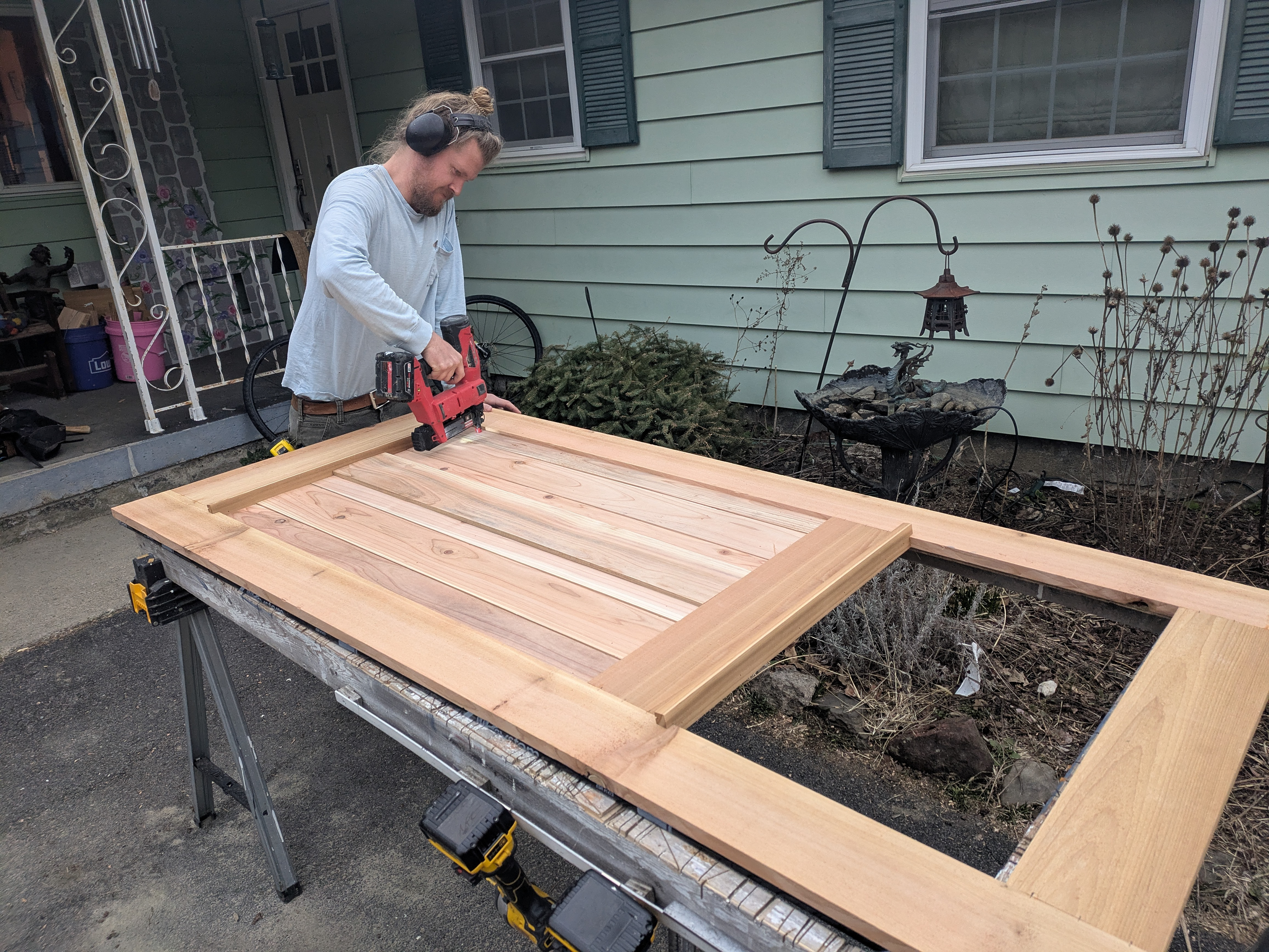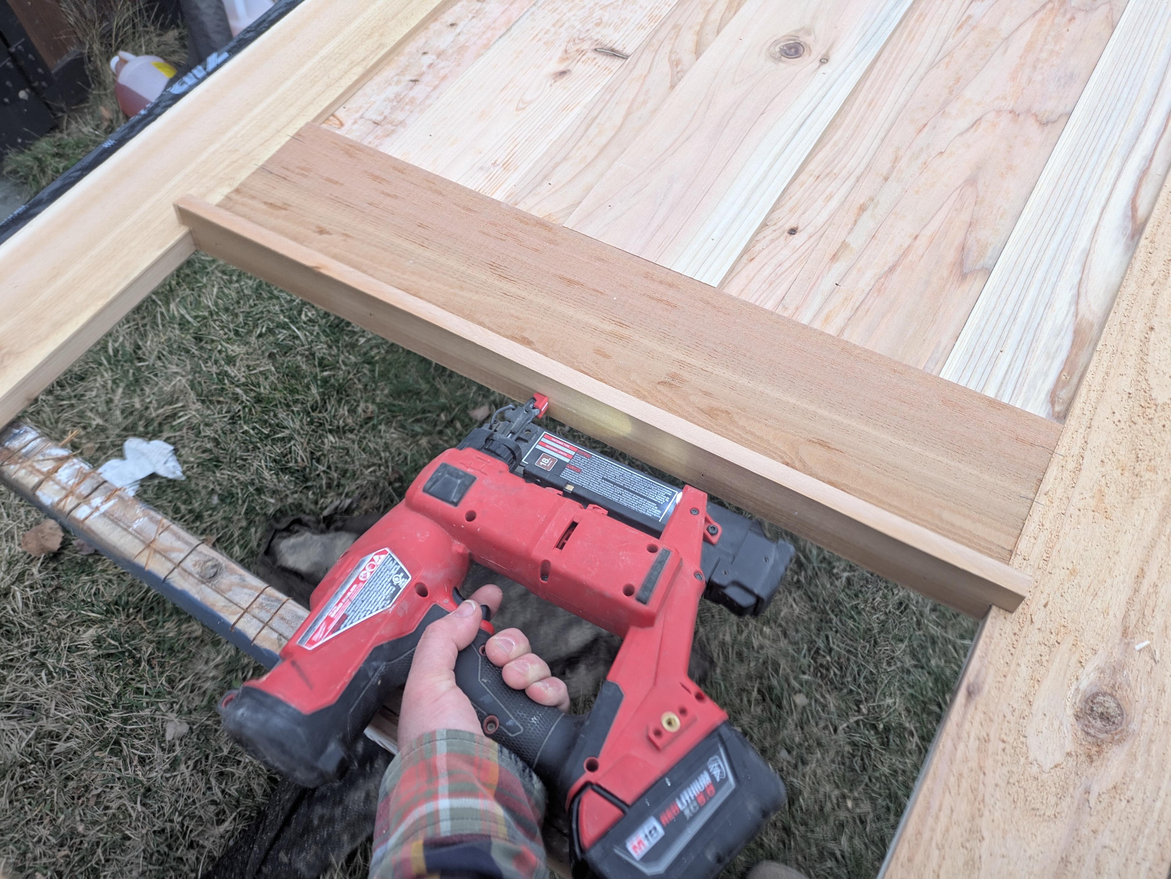 Cedar boards are planed to 7/16” thick, ship lapped with a dado blade and end-cut to match the 10 degree angle of the drip cap. These boards are then nailed to the sheathing to create the panel. A 7/16” thick decorative center stile is face nailed to the panel.