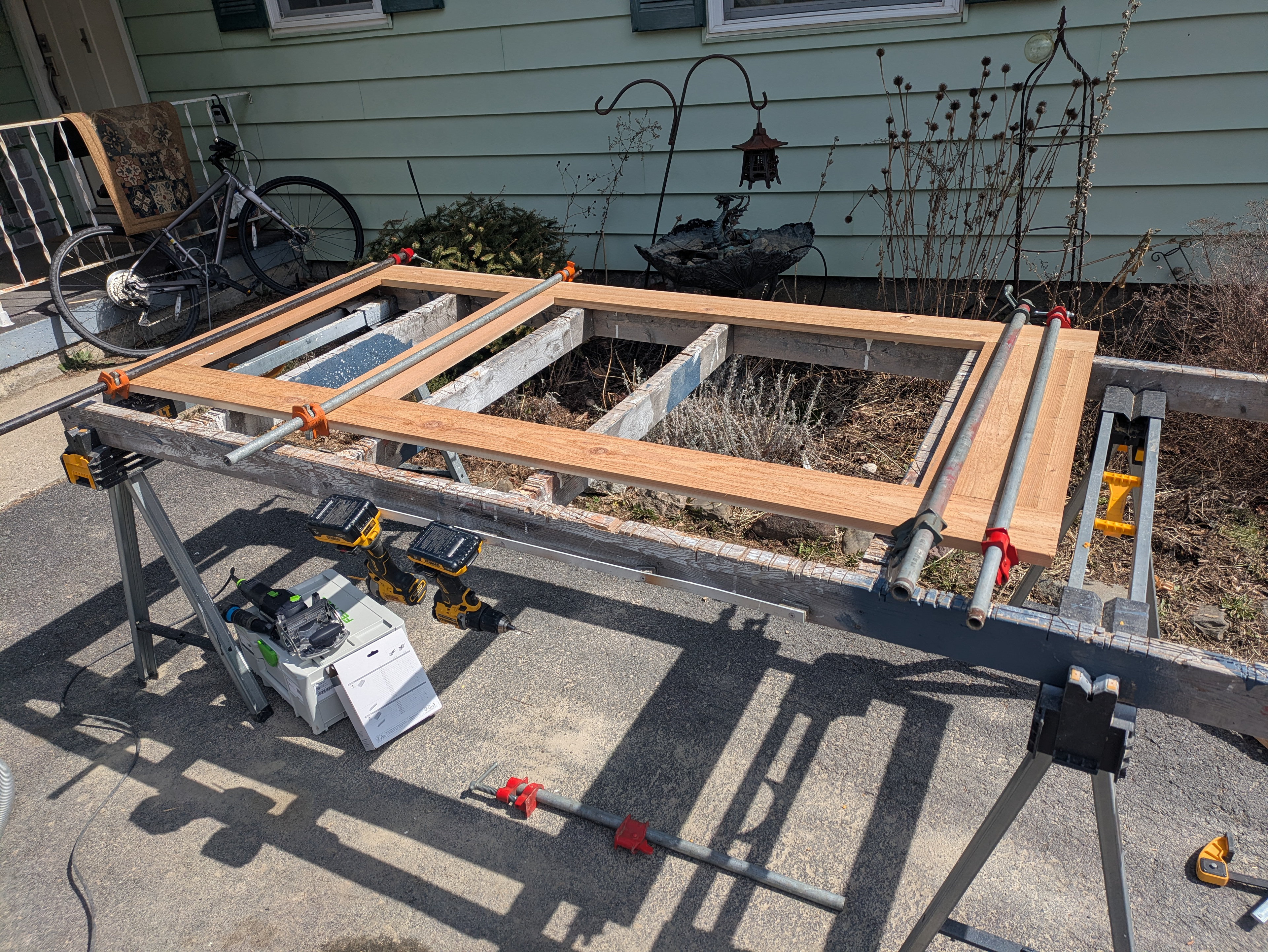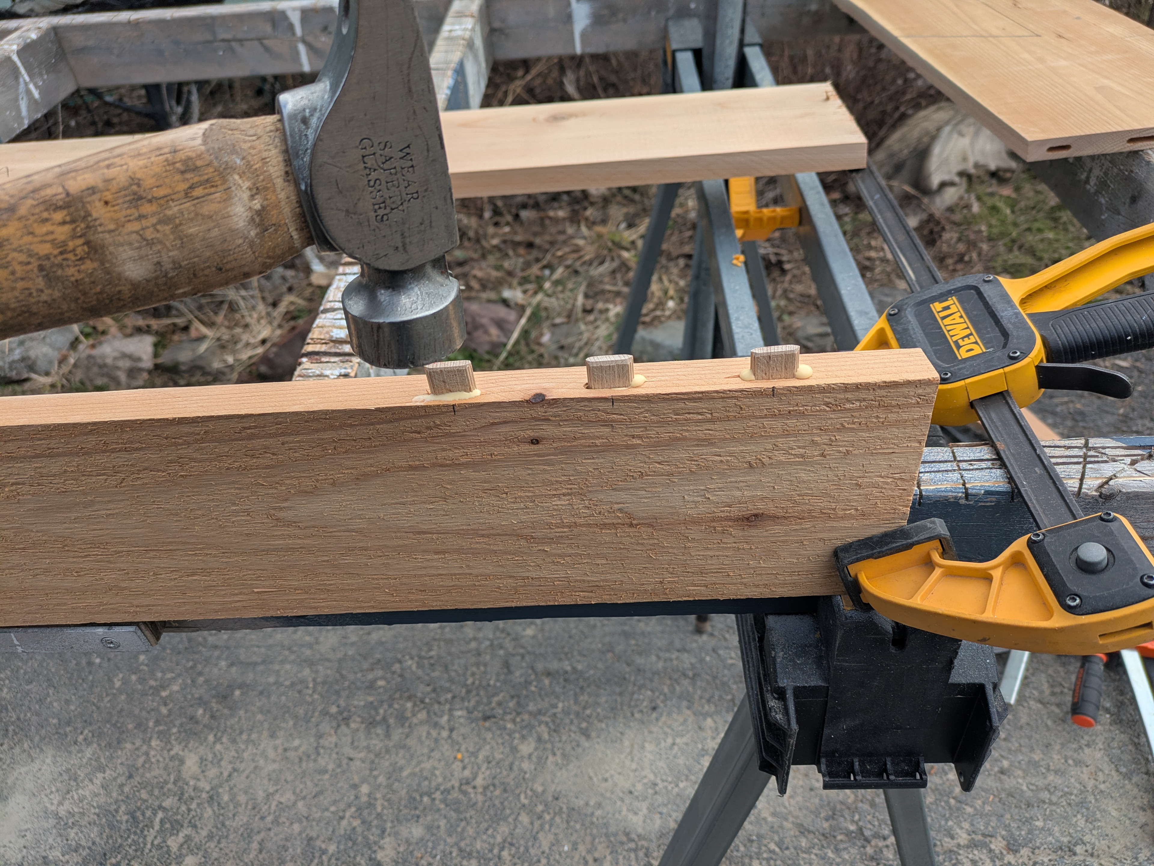 The rails are glued and clamped to the stiles.