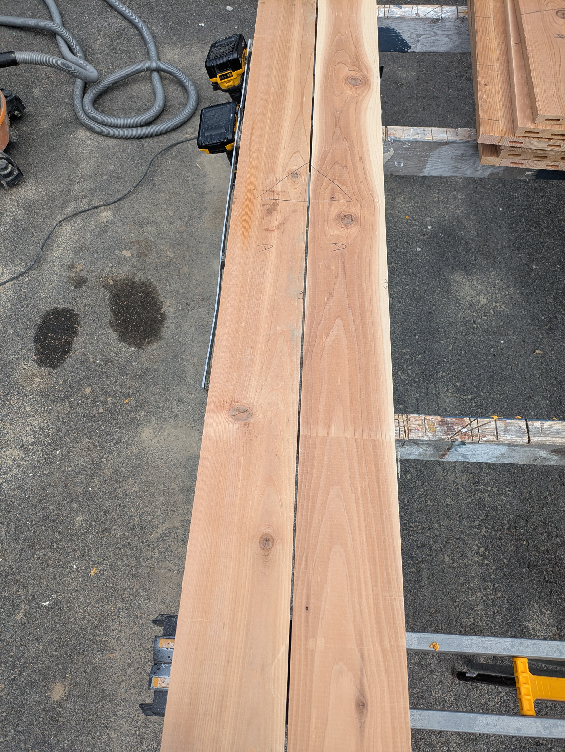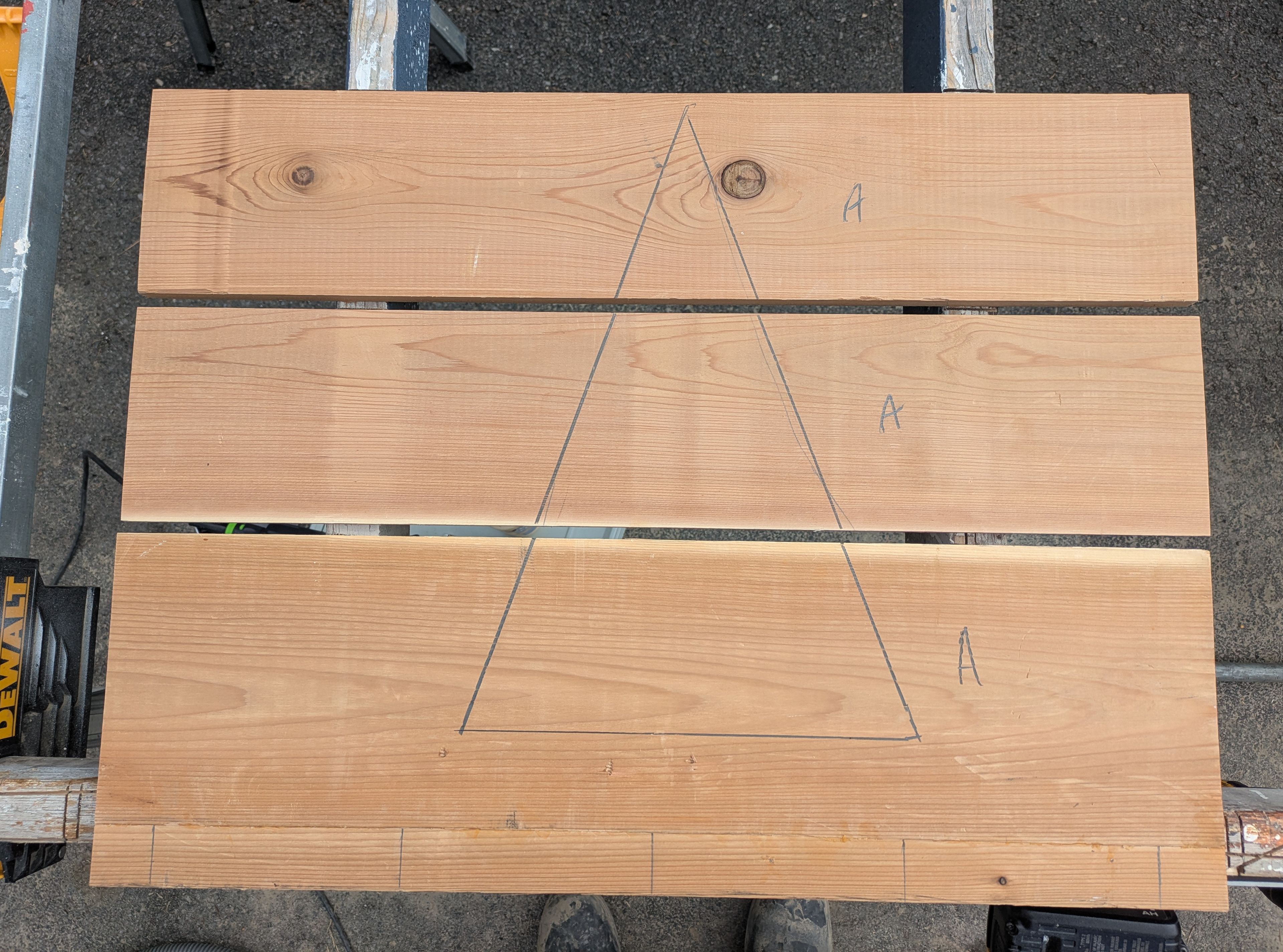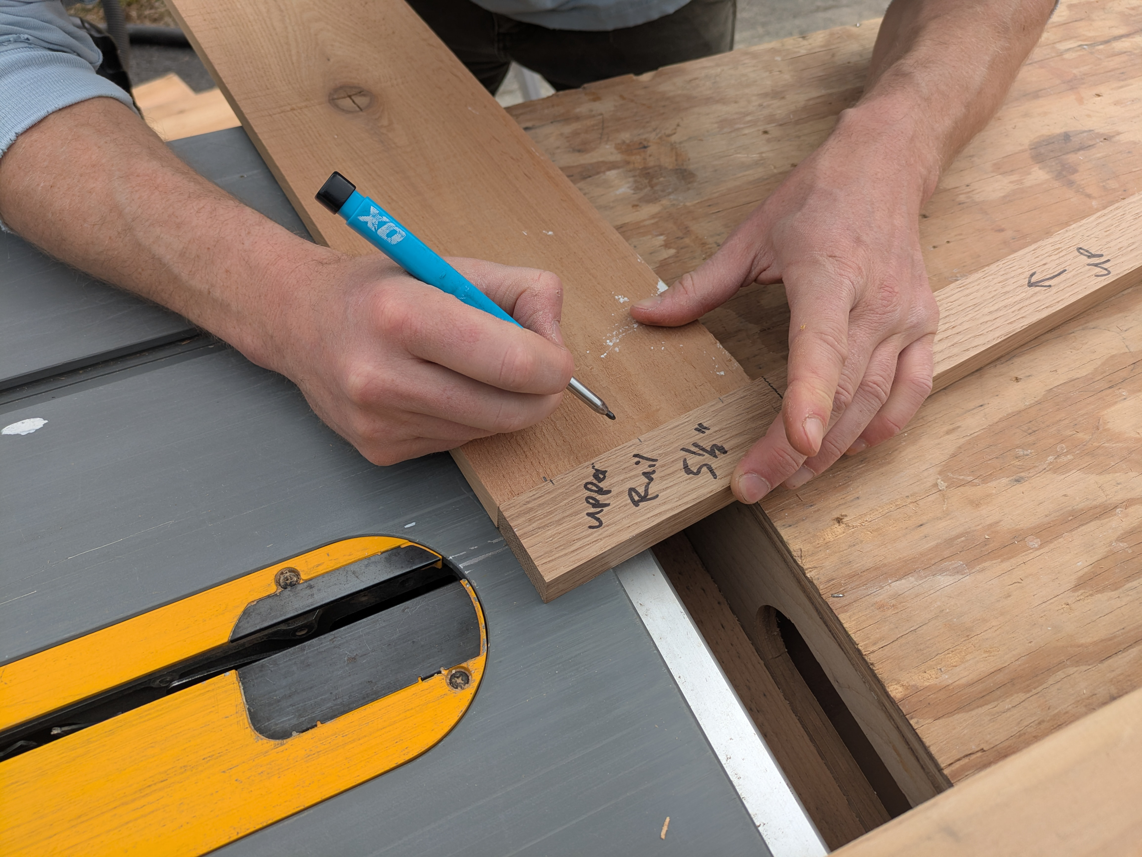 Rails are the horizontal boards of the door frame. The rails are cut to length and marked with a triangle on the backside to help us keep track of the rails’ orientation during the build. The rails are also marked for either door A or door B.