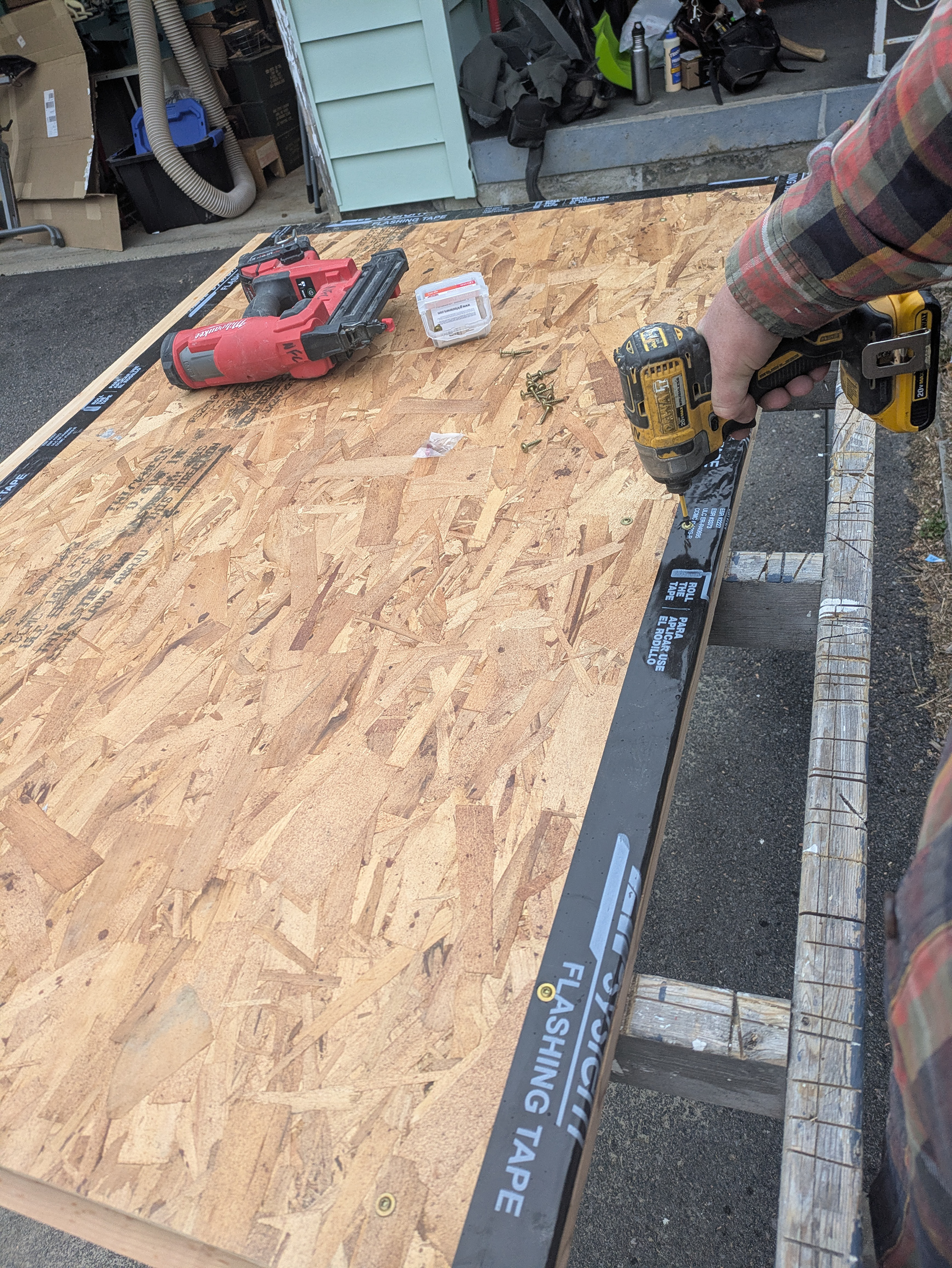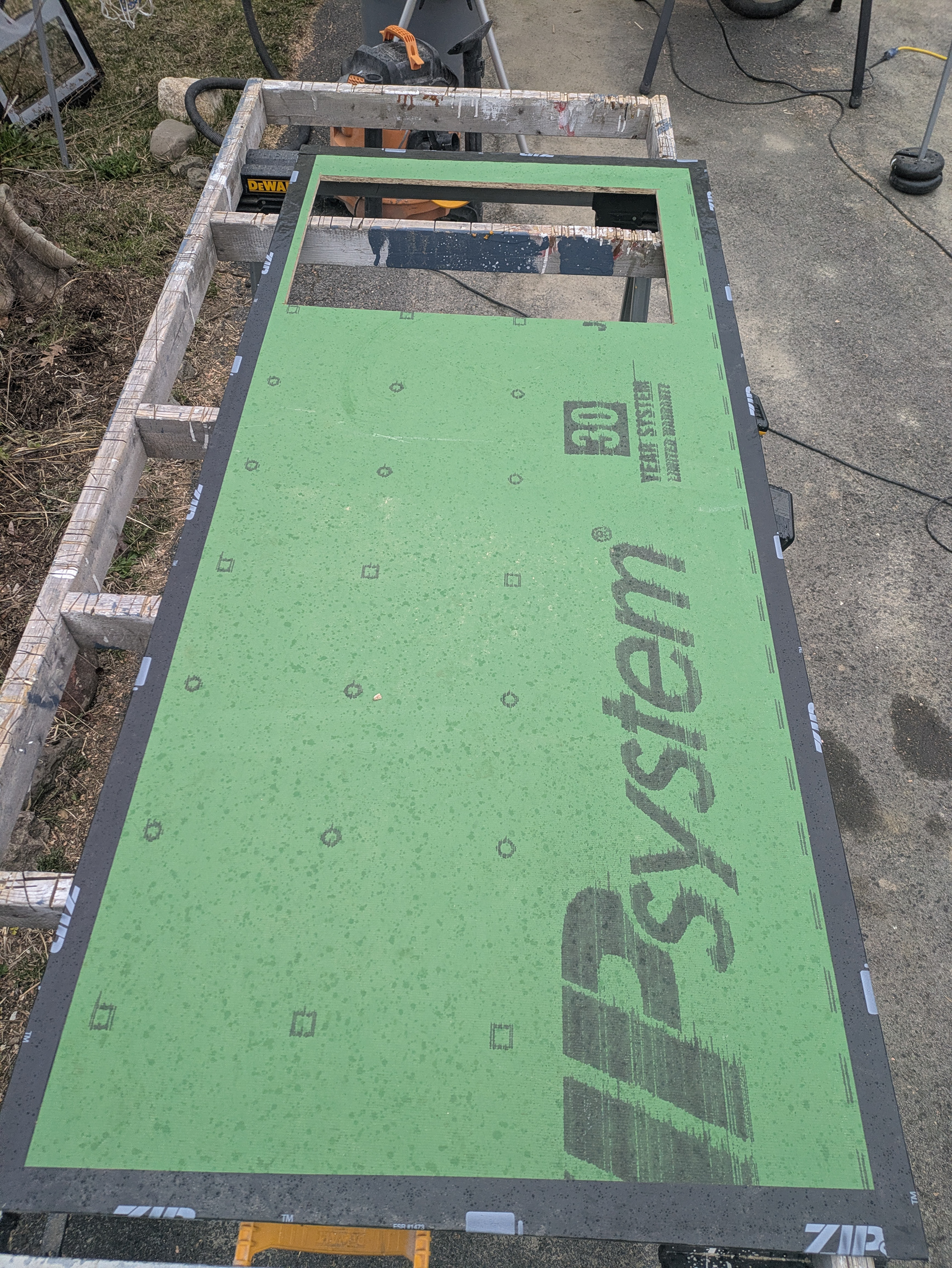 The outline of the frame is transferred to sheathing which is then cut to size. The exposed outer edges of the sheathing are protected with flashing tape. The sheathing panel of one door is a couple of inches wider than the door. The sheathing panel of the other door is about 2 ½” narrower than the door. This will allow one door to remain operational while the other door is locked in place with a cane bolt.