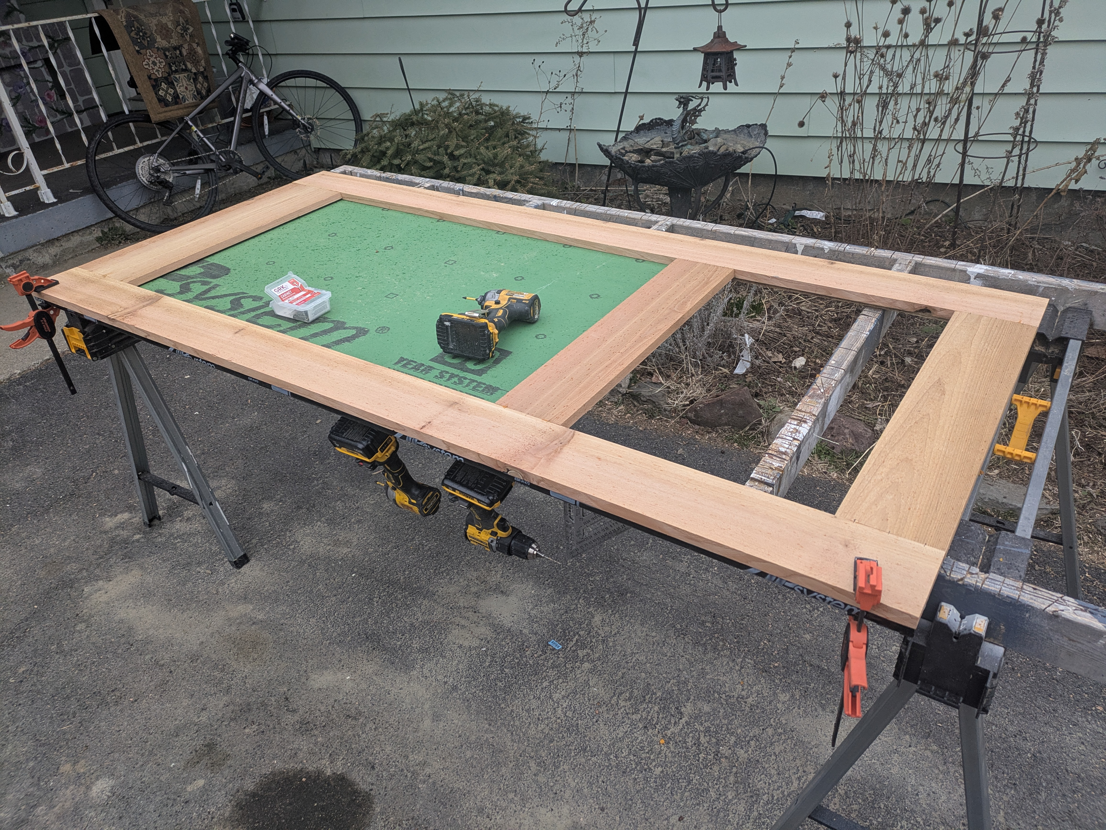 The door frame is clamped to the sheathing then flipped over for fastening.