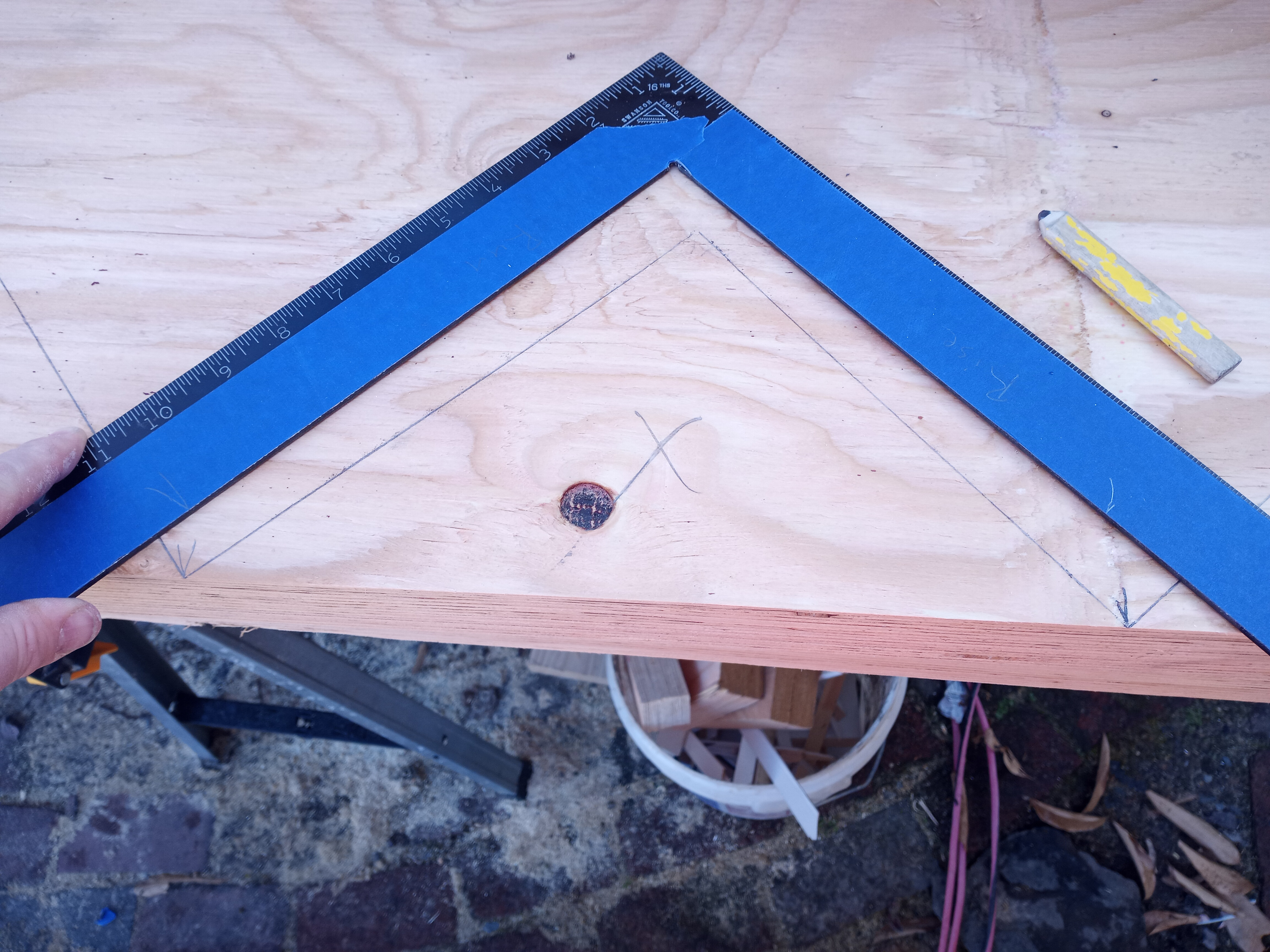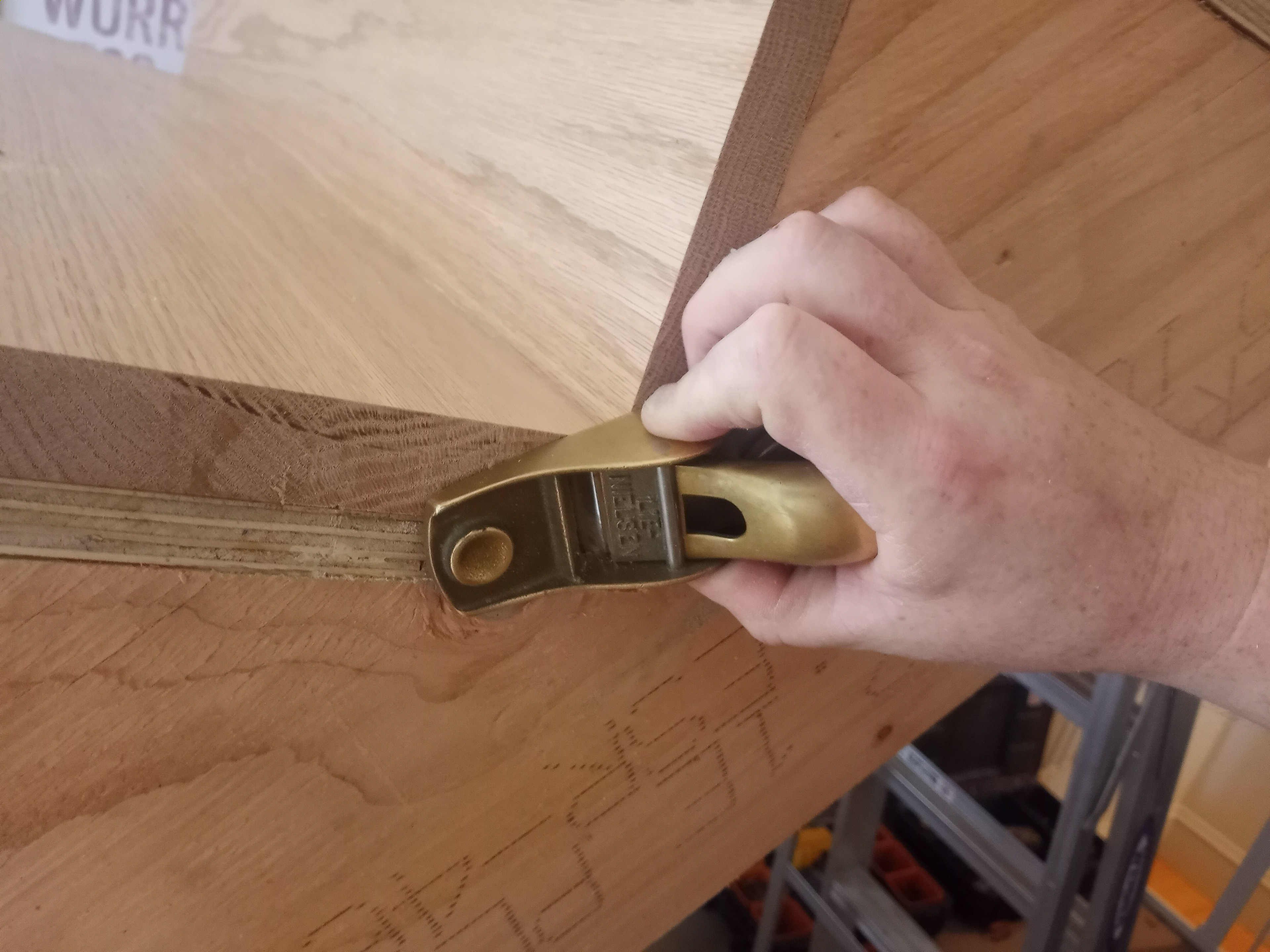 I'm tracing the luan templates onto the oak parts with a utility knife and blue tape for final fitting with the miter saw and block plane.