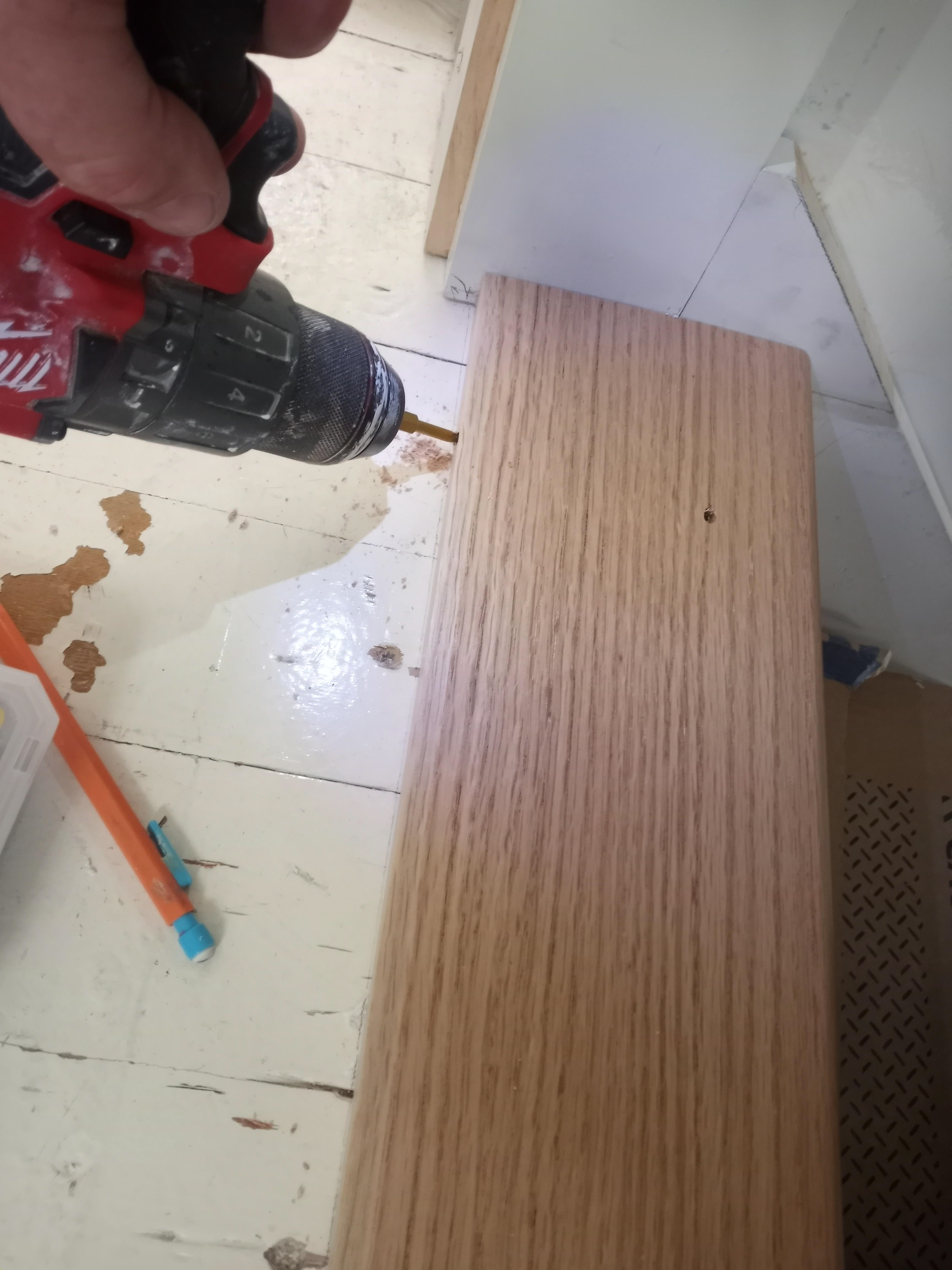 The hanger bolt is essentially a lag screw on the end that I'm driving into the newel post and a bolt end that will receive a hidden nut and washer installed from below the handrail.