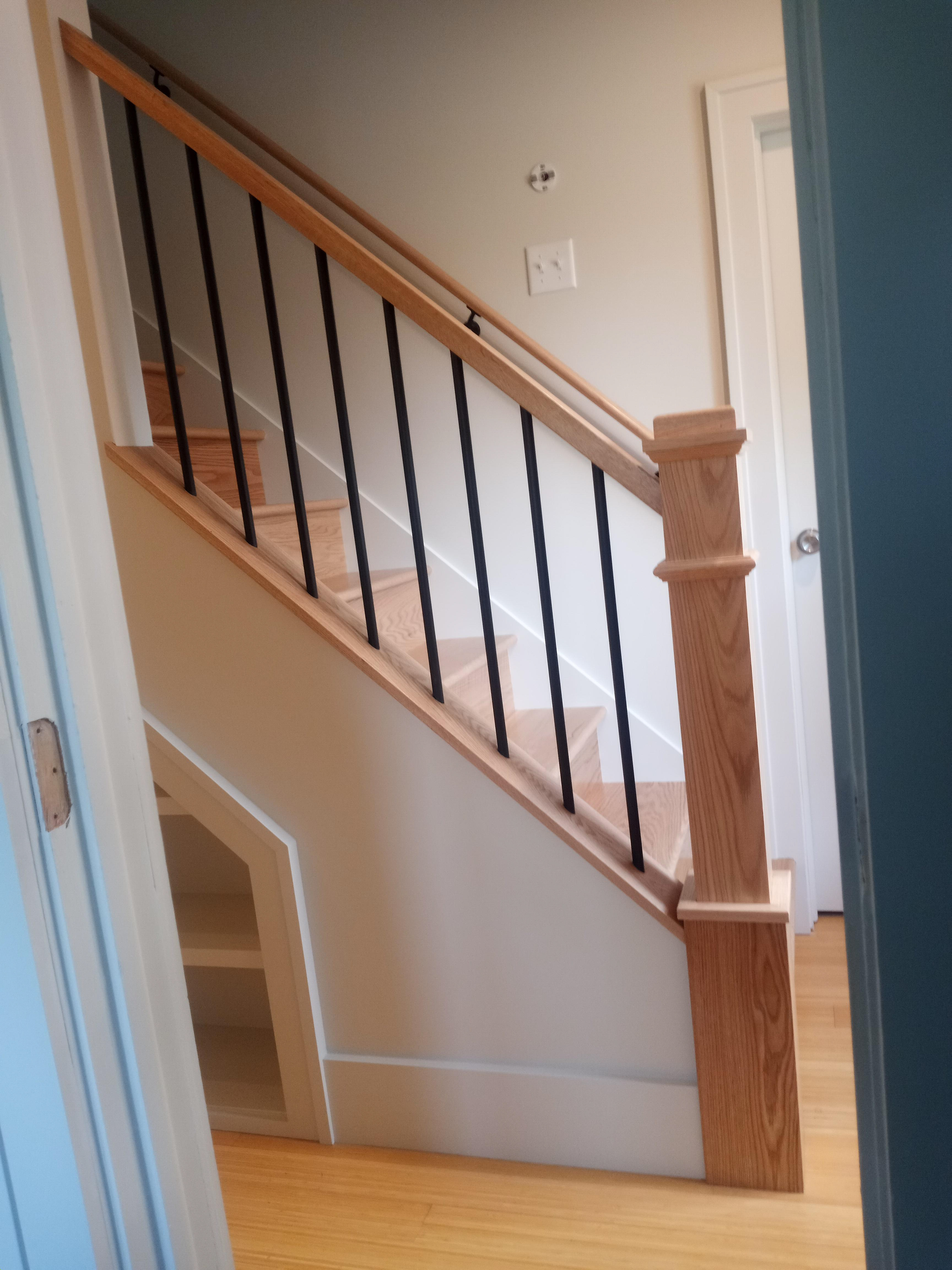 The finishing touches include pin nailing some little custom trim pieces to the newel at the top of the sleeve, floating out the existing wavy wall to hide the gap between the stringer and the sheetrock, filling some fastener holes, cutting and installing a graspable handrail. I'll leave it to the painter to apply the final coat of polyurethane.