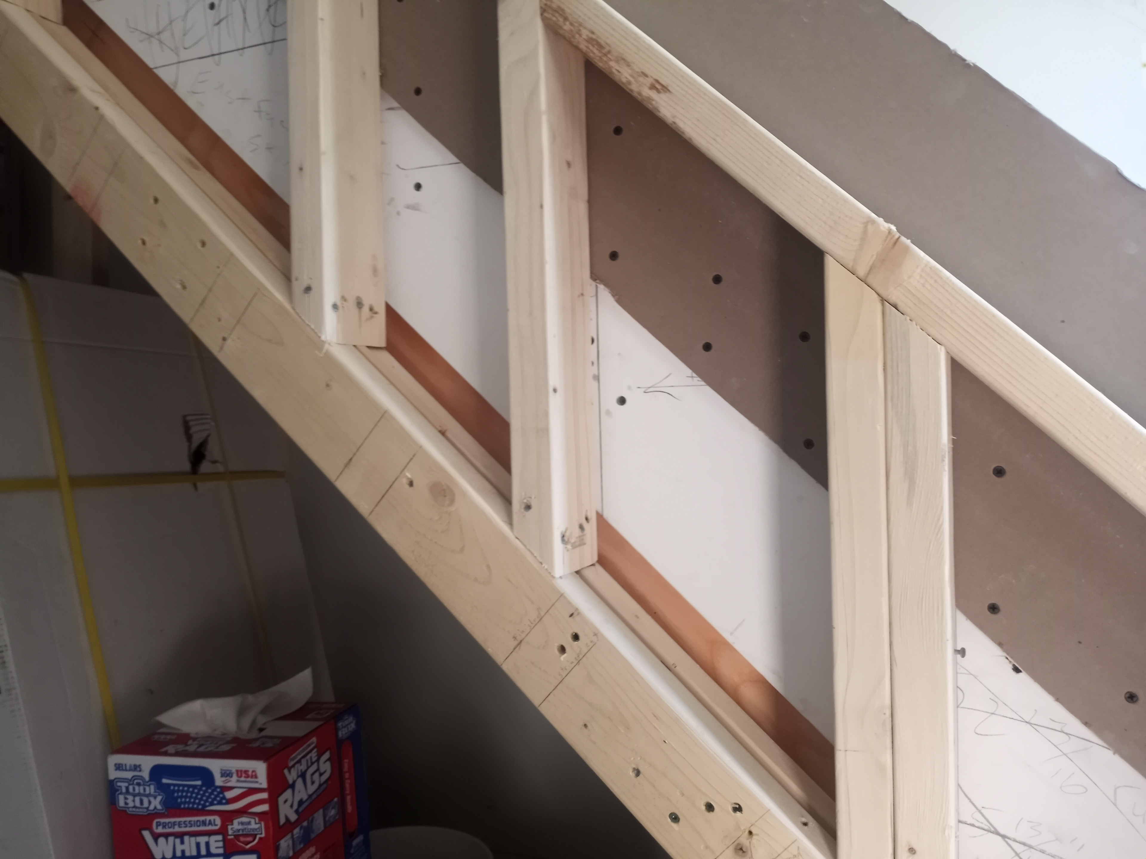 With the stairs installed I proceeded to framing and sheetrocking the supporting walls under the stairs. I've fastened the sheetrock directly to the backside of the skirtboard with 1" screws for a seamless look that will allow me to forgo installing basecap along the top of the skirtboard.