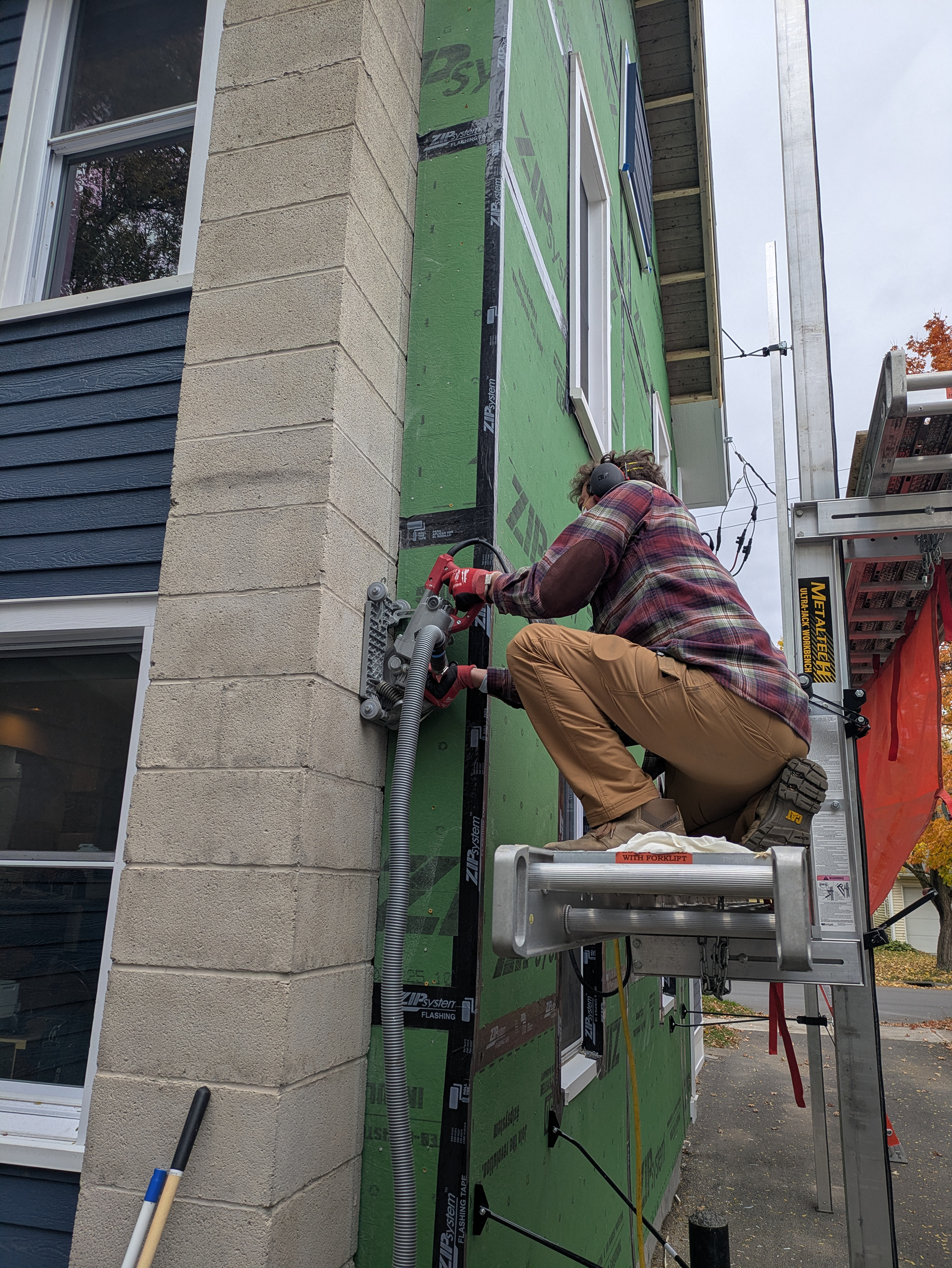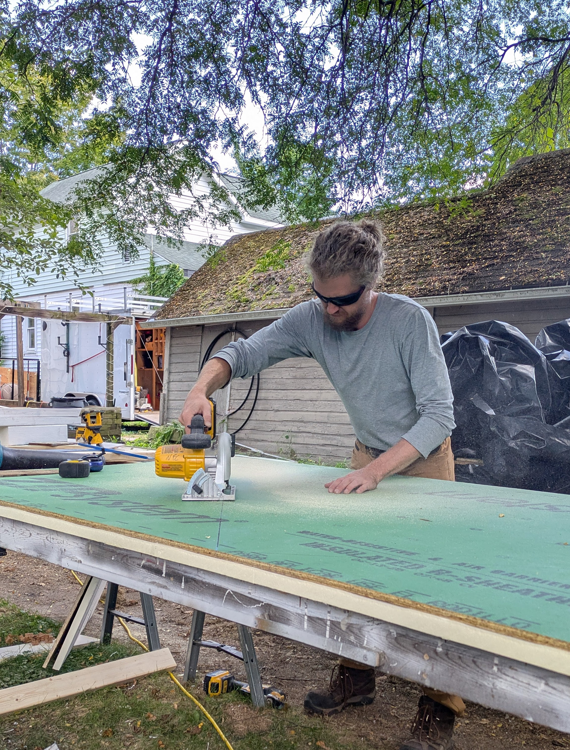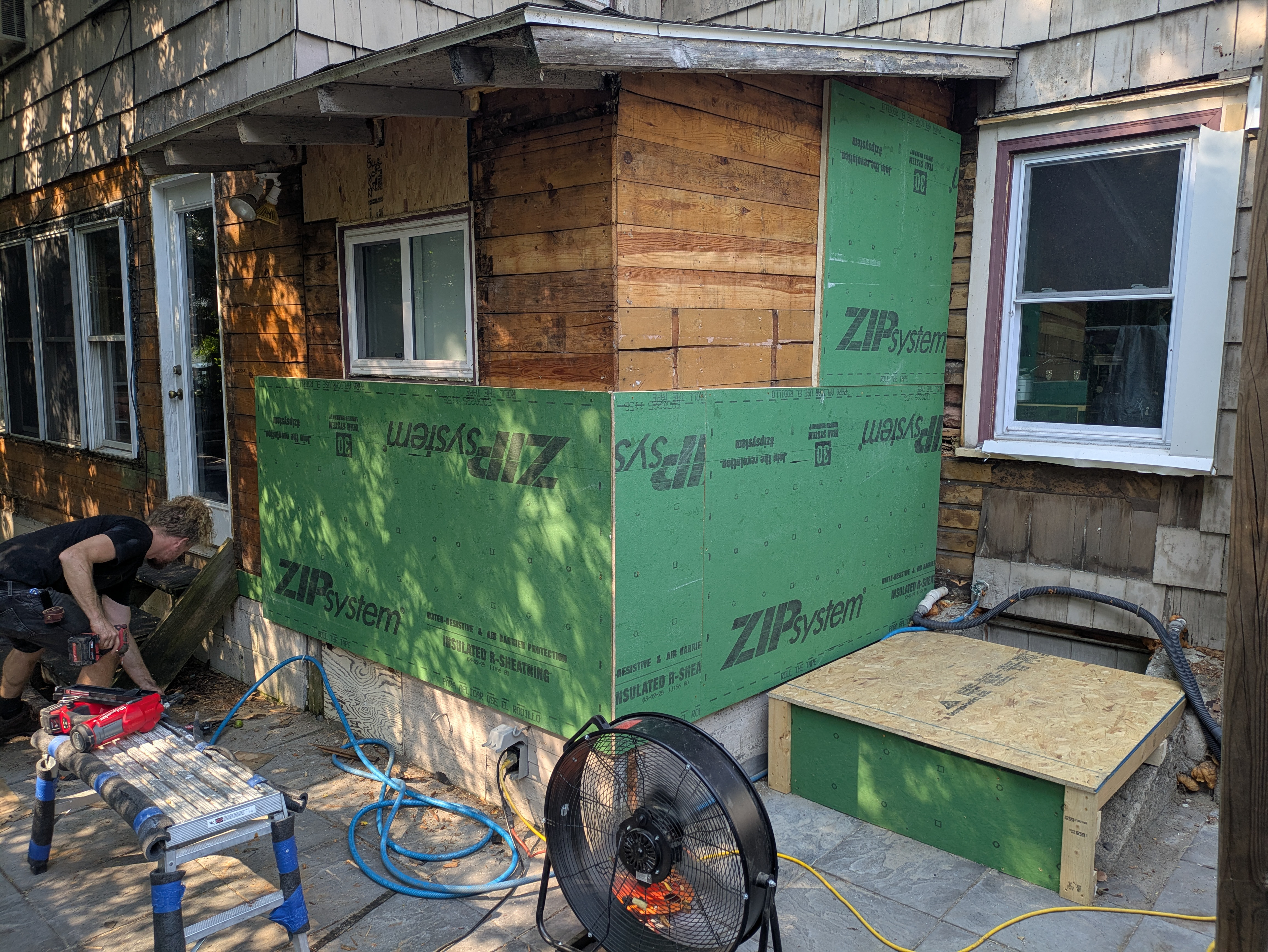 New sheathing with an integrated vapor barrier and 1” of rigid insulation is cut.