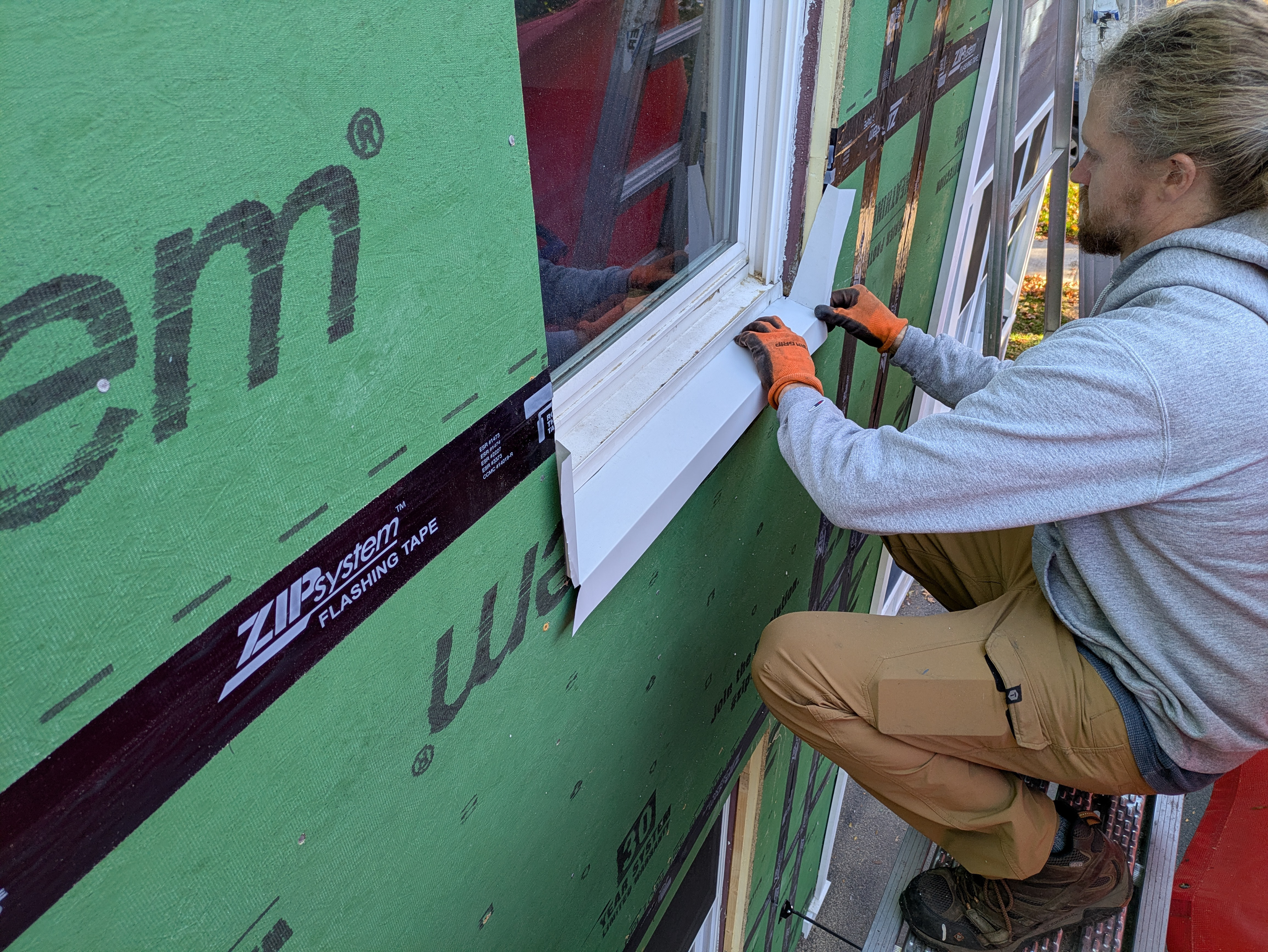 The sides and top of the windows are flashed in a similar fashion. The flashing seams are caulked and taped to the sheathing. The sill flashing is left un-taped so that it can drain if needed.