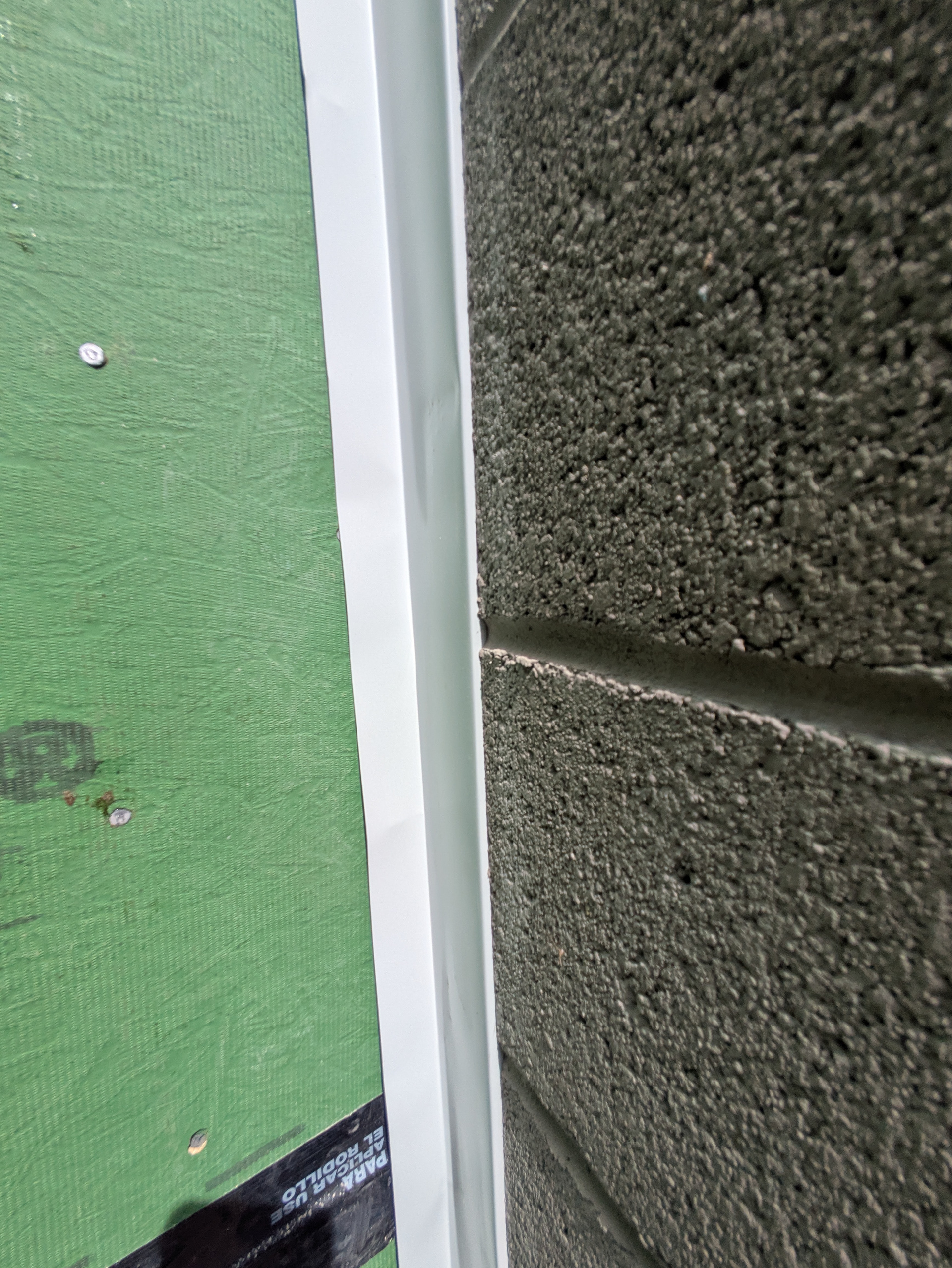 Reglet flashing keeps water from getting behind the sheathing at the chimney-sheathing junction. A ½” deep groove is cut vertically into the cmu chimney with a masonry saw about 1 ½” away from the sheathing.