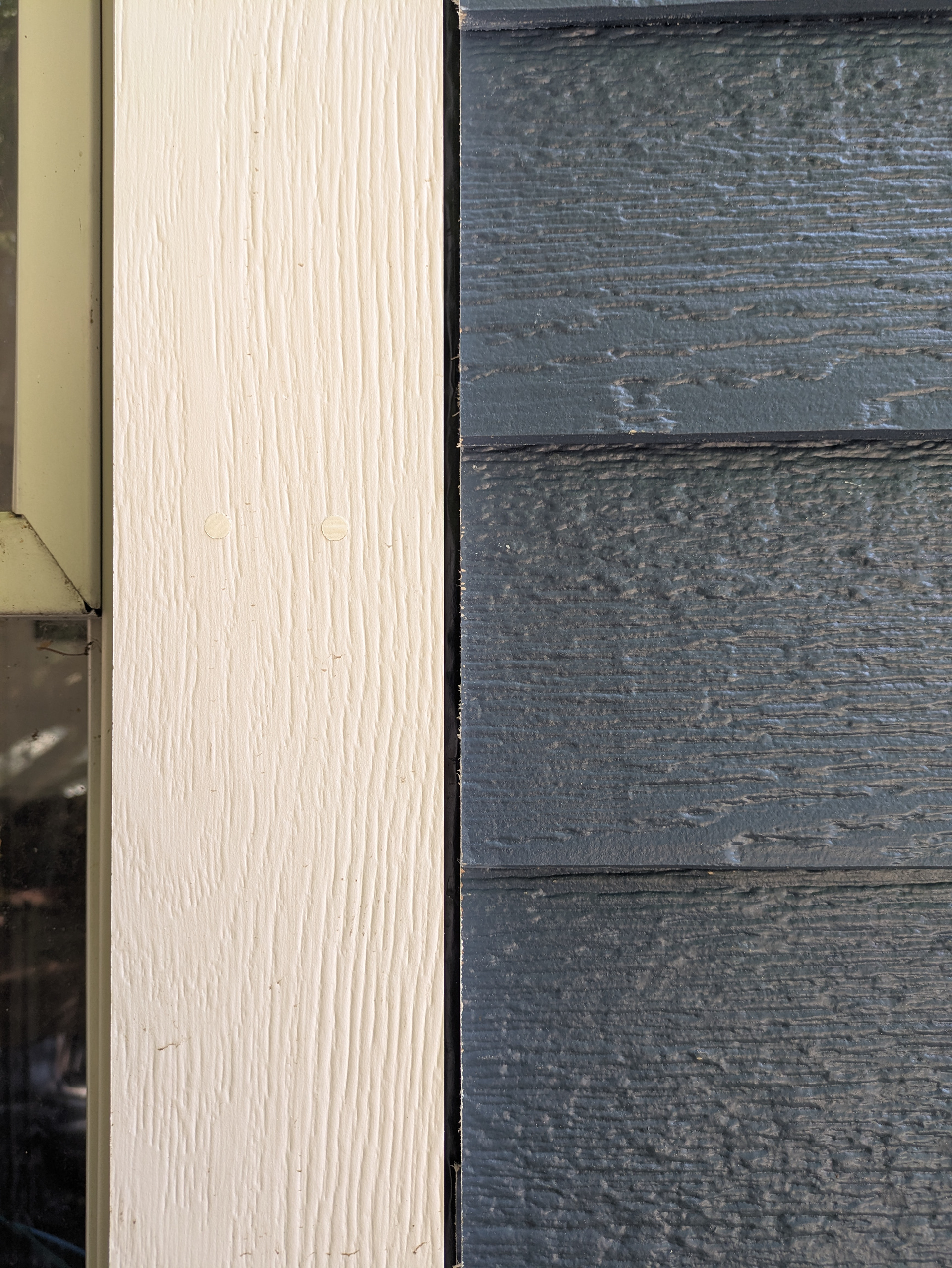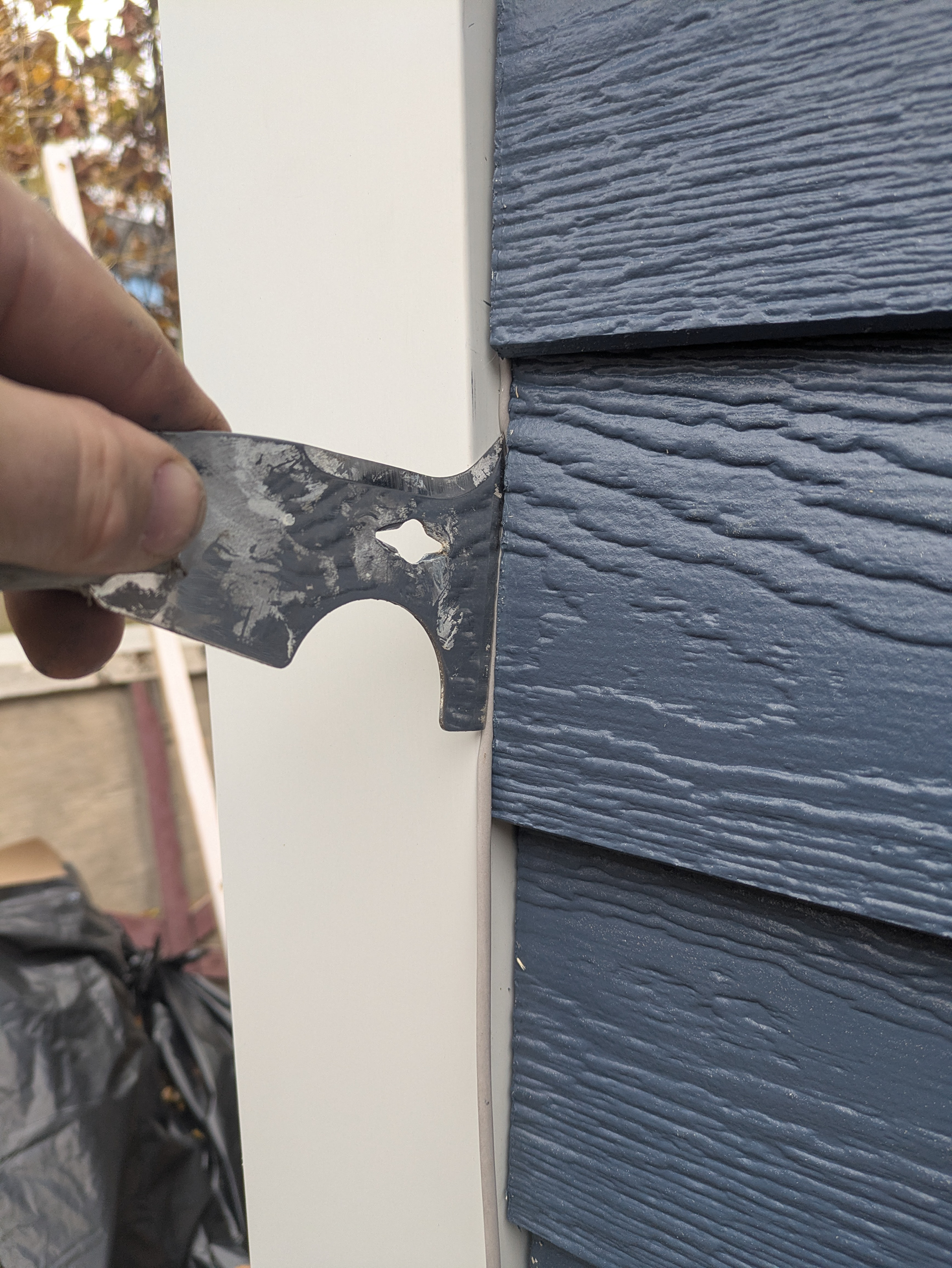 An expansion gap is left between the trim and siding as per the manufacturer’s installation instructions. This gap allows for the siding and trim to expand and contract seasonally without buckling.