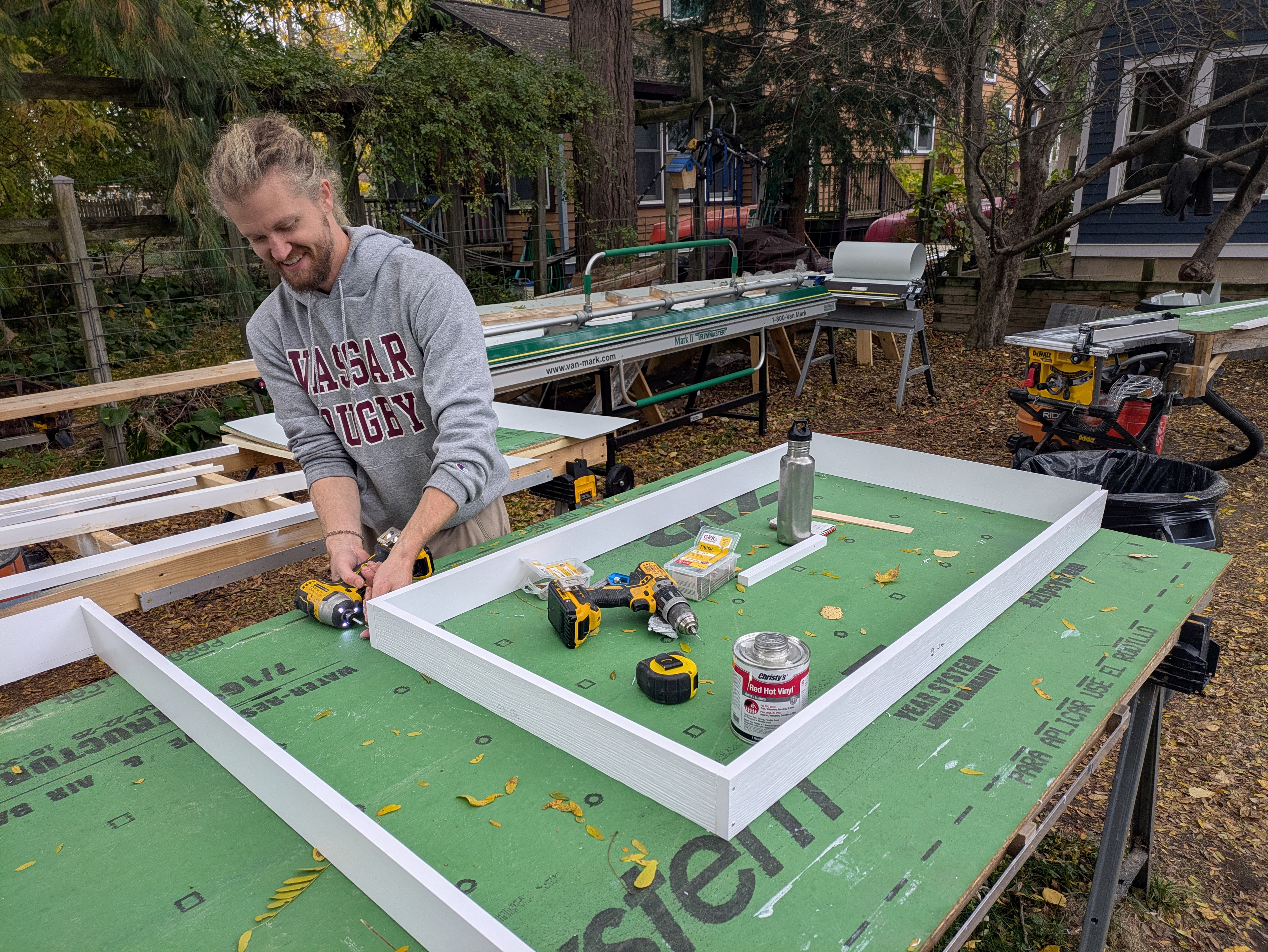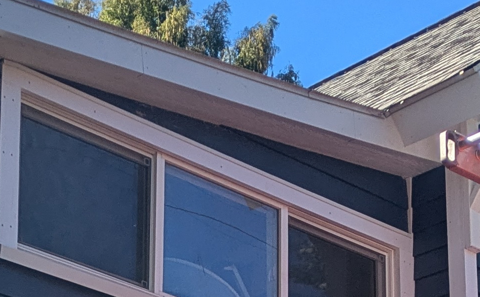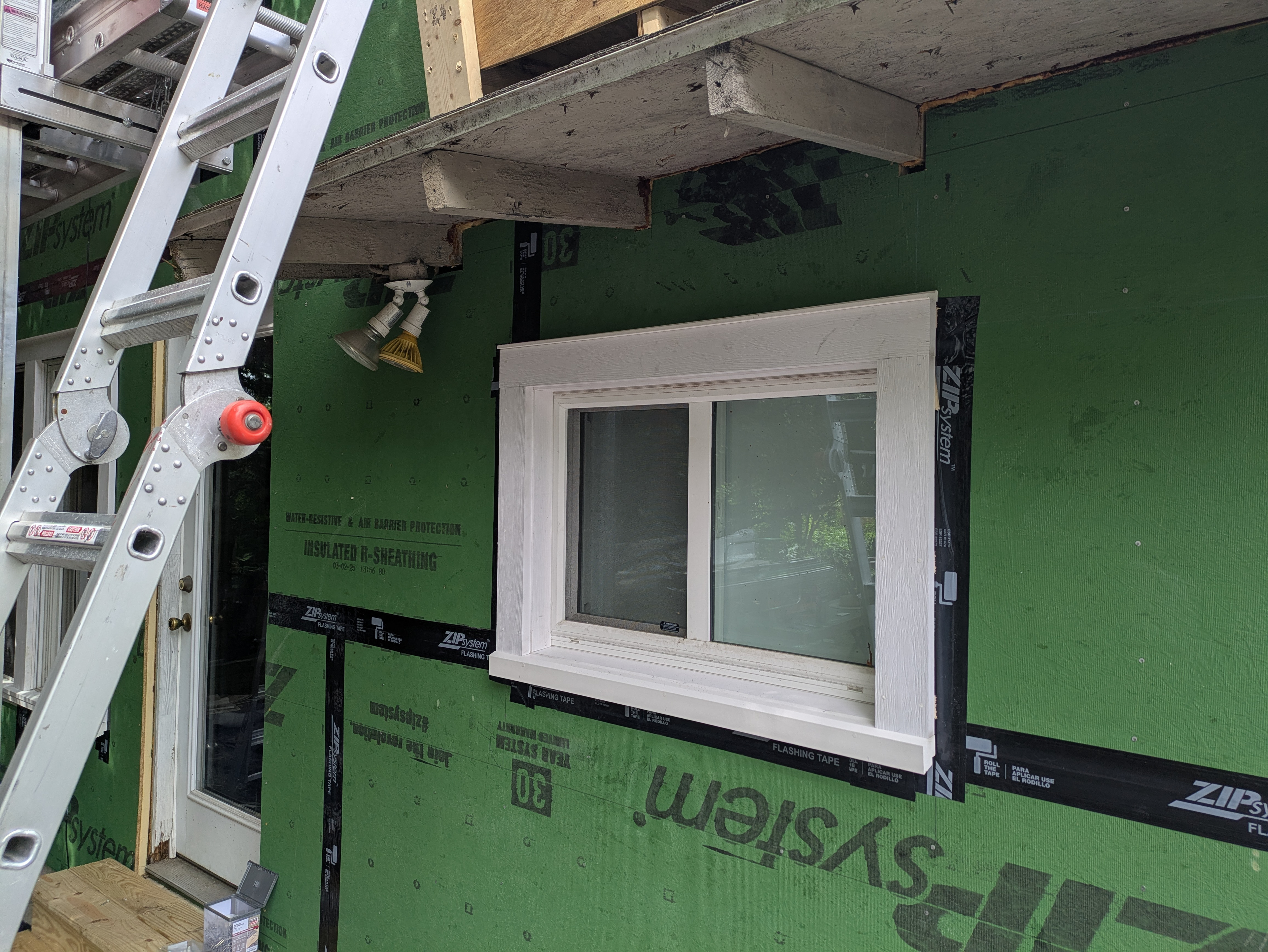 New composite trim is installed throughout. Window extension jambs and casing are pre-assembled as a complete unit on the workbench. Mahogany domino tenons, PVC adhesive and 5" trim screws are used to assemble the casing and sills. Sub fascia is installed, LP smartside soffit panels are installed under the rafter tails and the sub fascia is wrapped with custom bent aluminum coil stock.