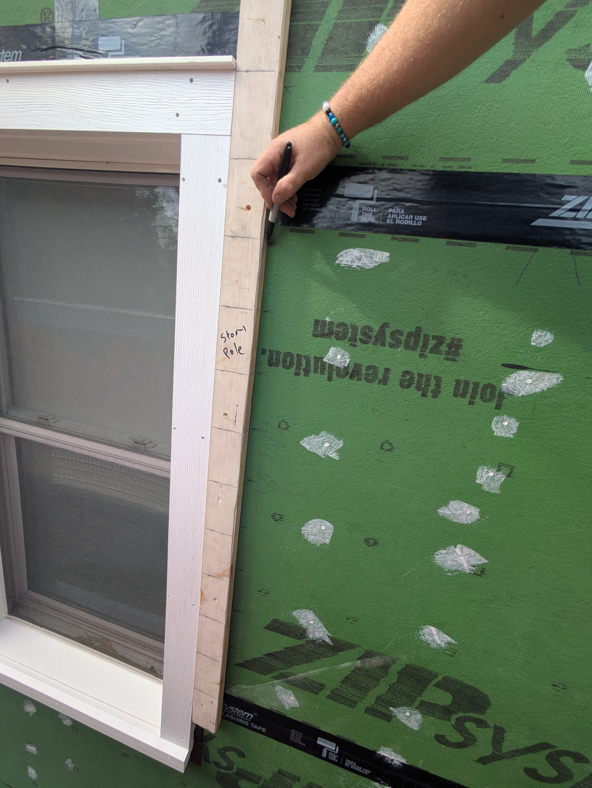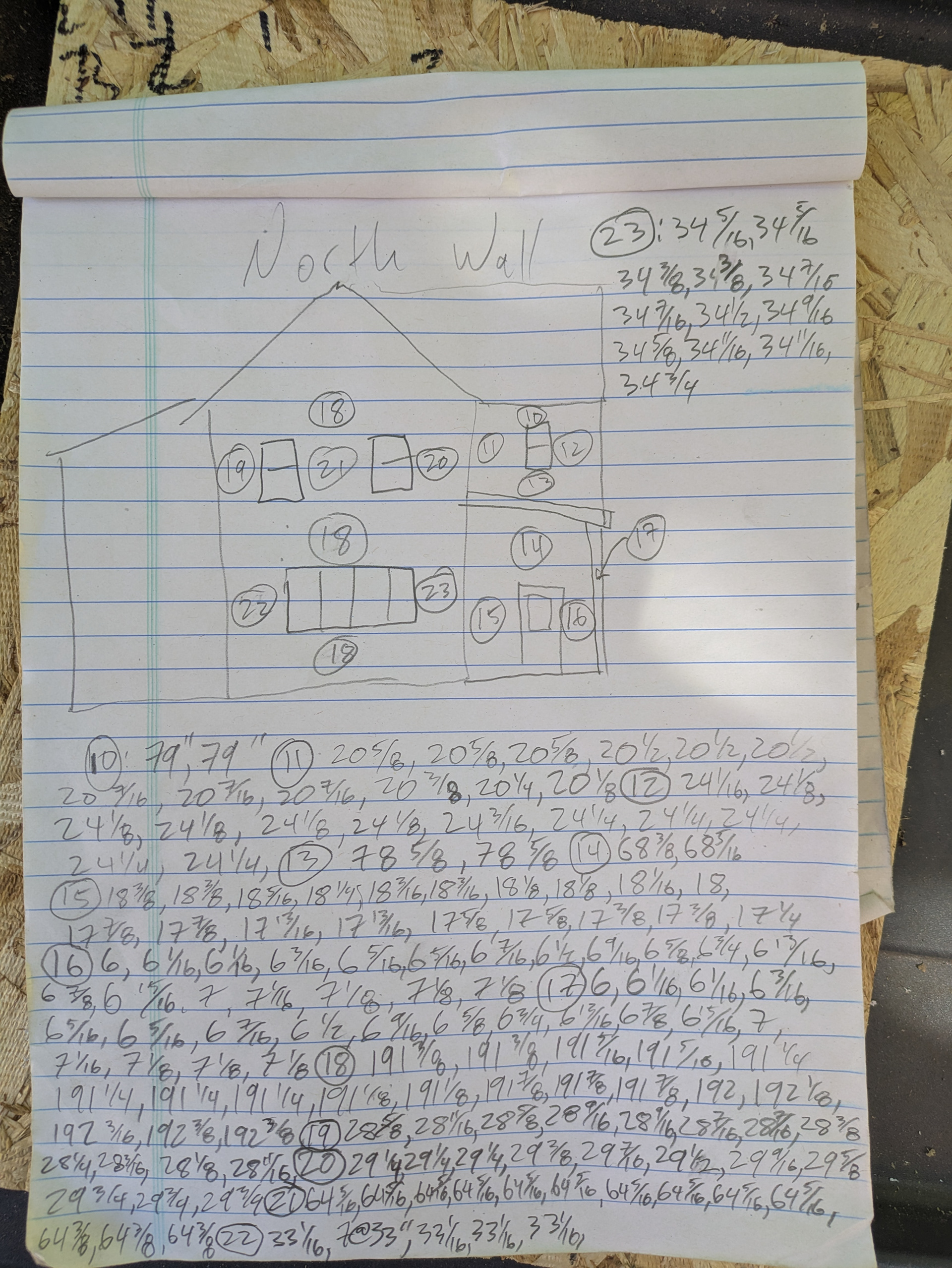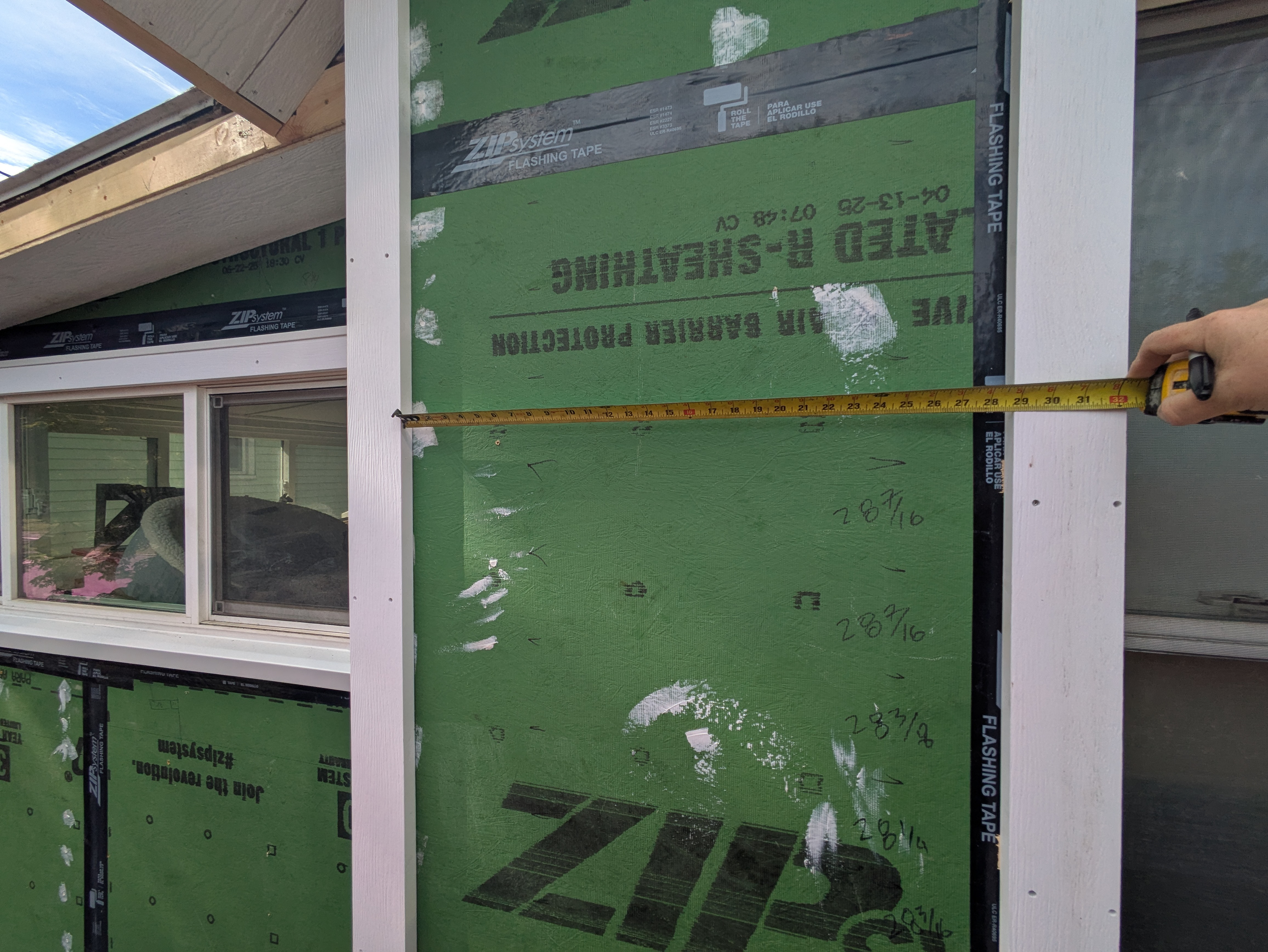 Each course of siding is measured with either a steel measuring tape or laser distance measurer. The lengths of each course of siding are then written in permanent marker on the sheathing at their respective locations.