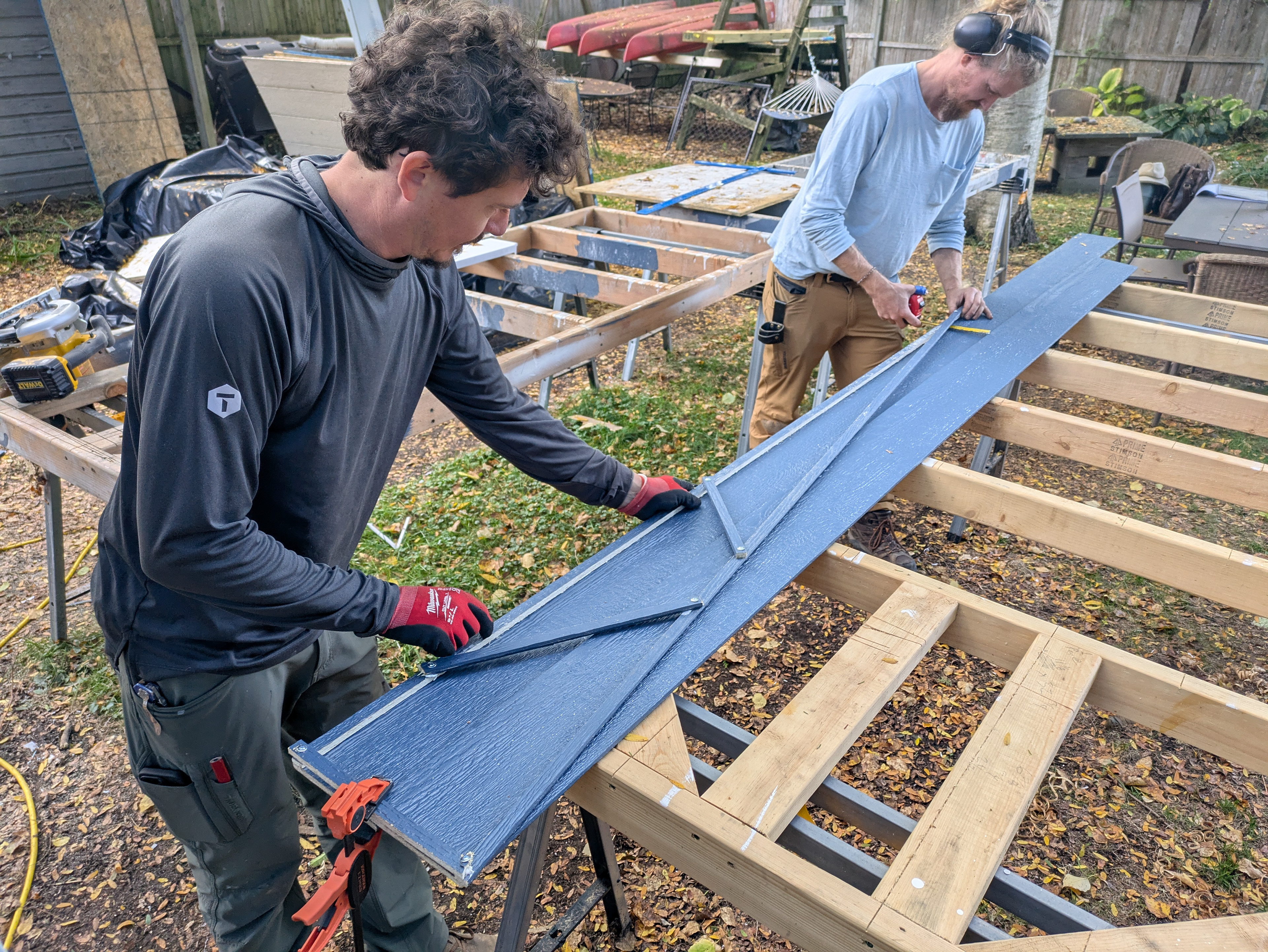 Difficult to measure areas are templated with scraps of siding glued and screwed together. The template is then placed on an evenly spaced set of siding boards and traced for accurate cutting.