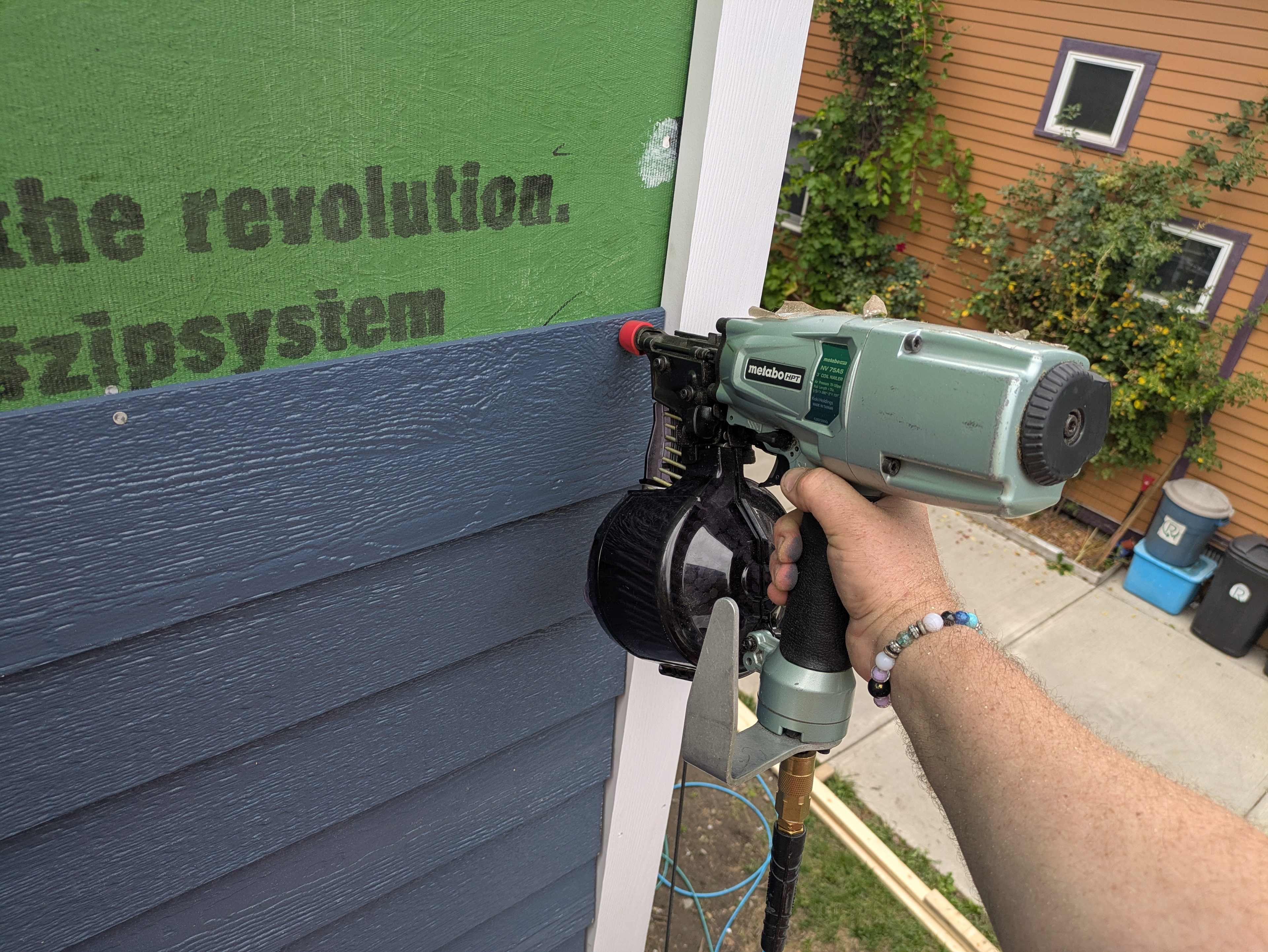 The siding is brought to the installers who nail it off with pneumatic siding nailers. The siding is nailed into the studs with long siding nails. LP smartside can be blind nailed which virtually eliminates visible fasteners that will require painting.