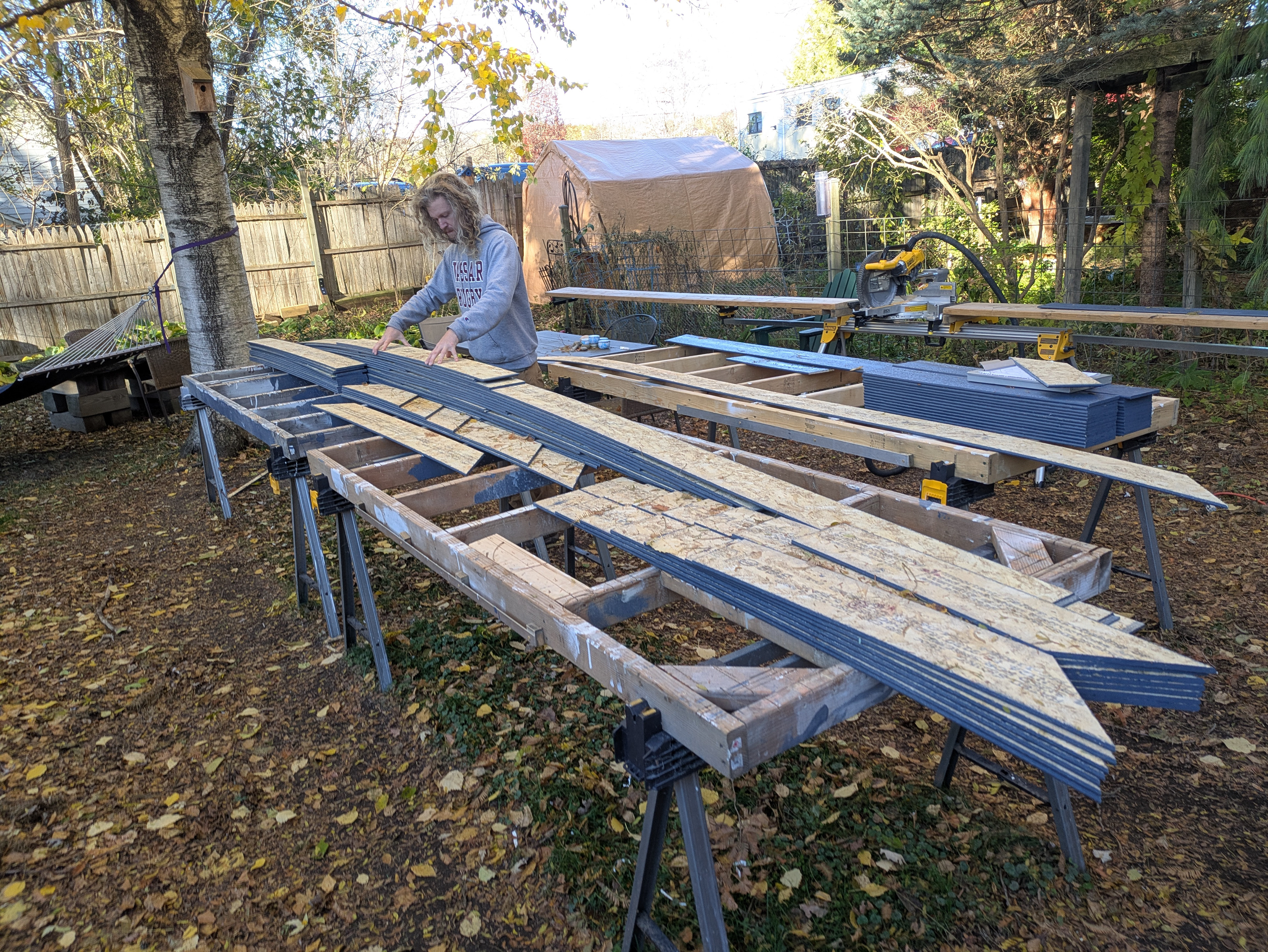 All of the siding for a given area is then cut, labeled on the backside and the cross cuts are primed and painted. Because the cut list starts at the top course and works its way down, each pile of siding for a given zone is naturally stacked with the lowest course on top for ease of installation.