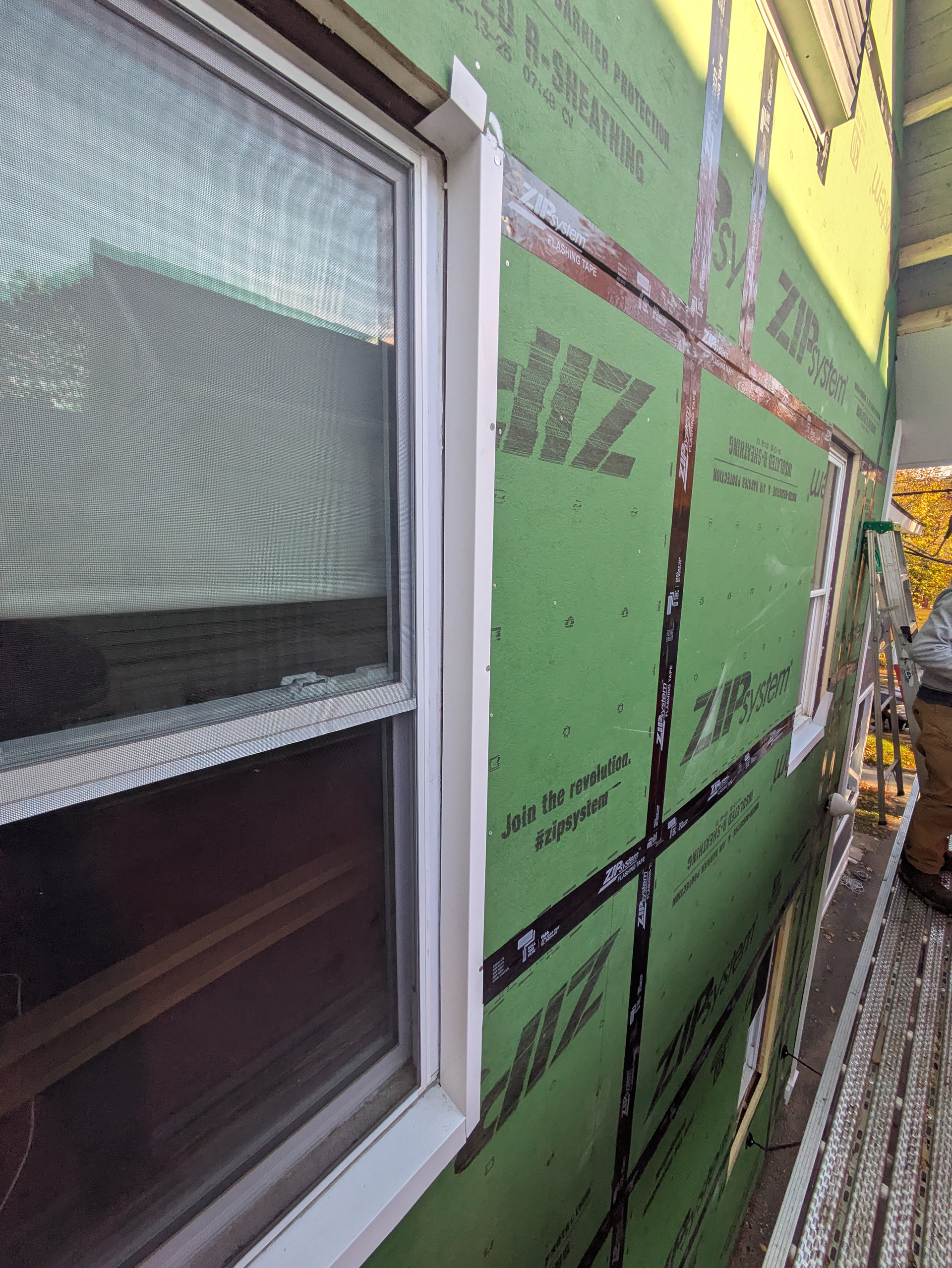 The existing windows will remain. The budget doesn’t allow for replacing all of the windows with new-construction windows with flanges.