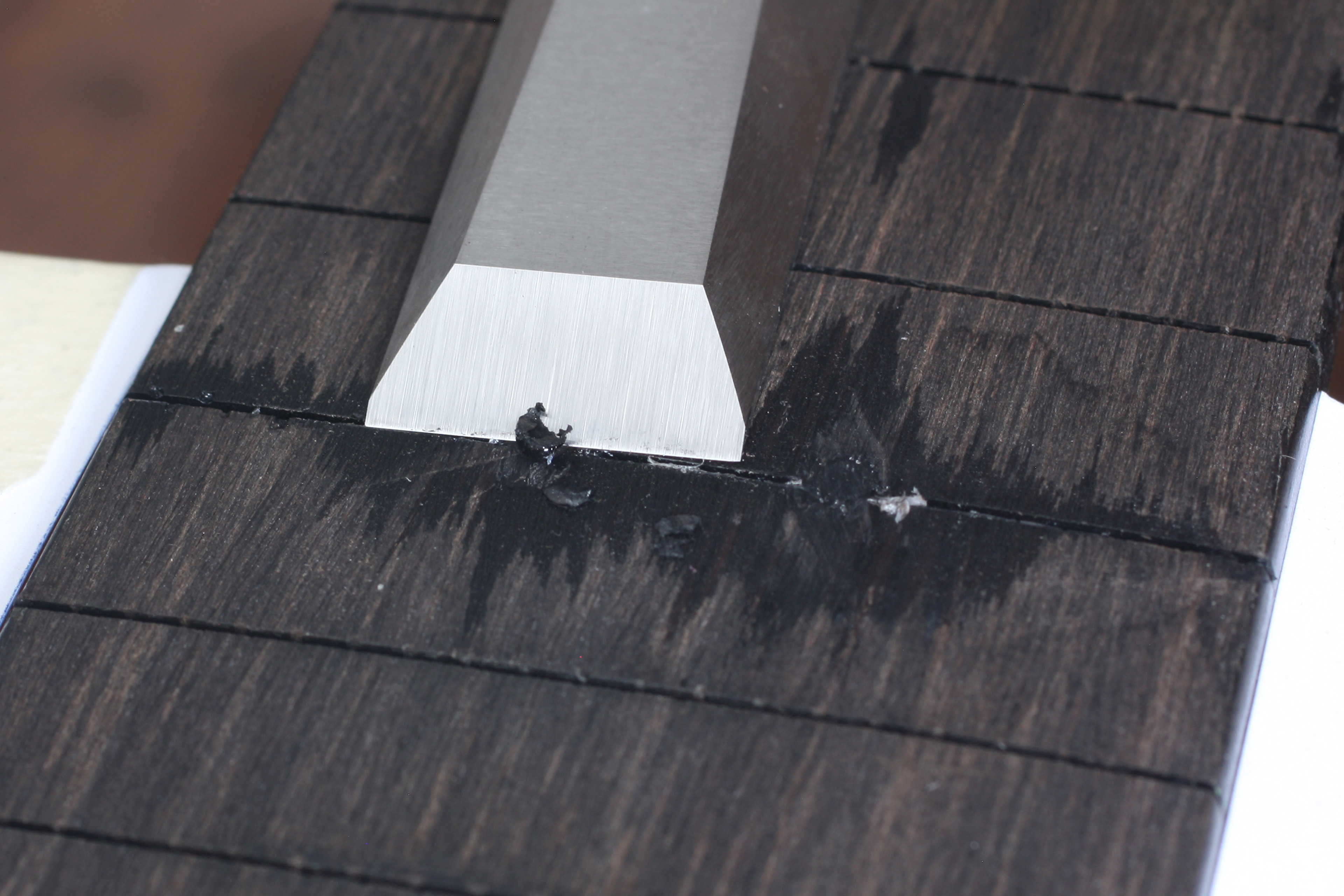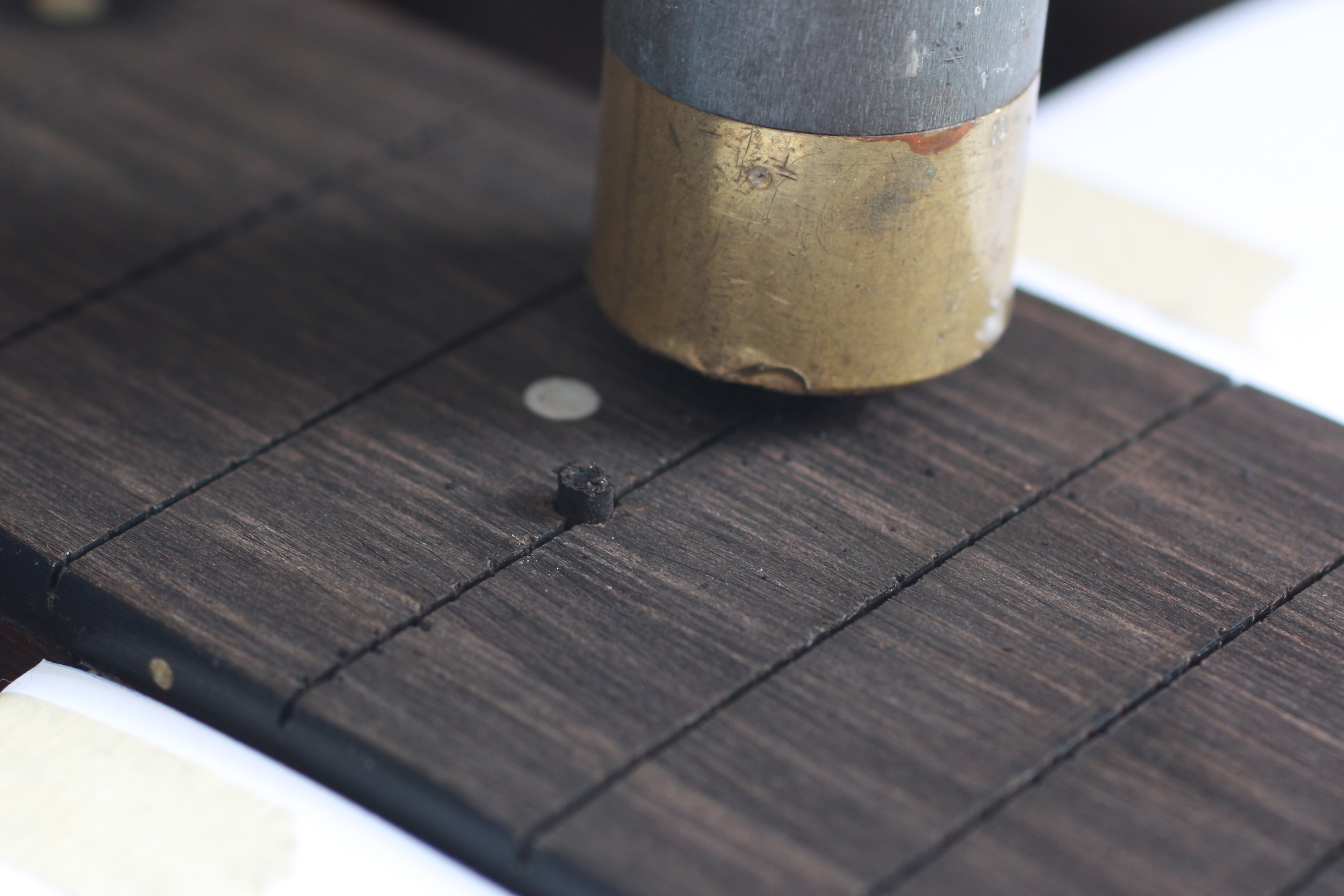 Trimming the plugs flush to the fretboard after gluing them in with thin super glue.