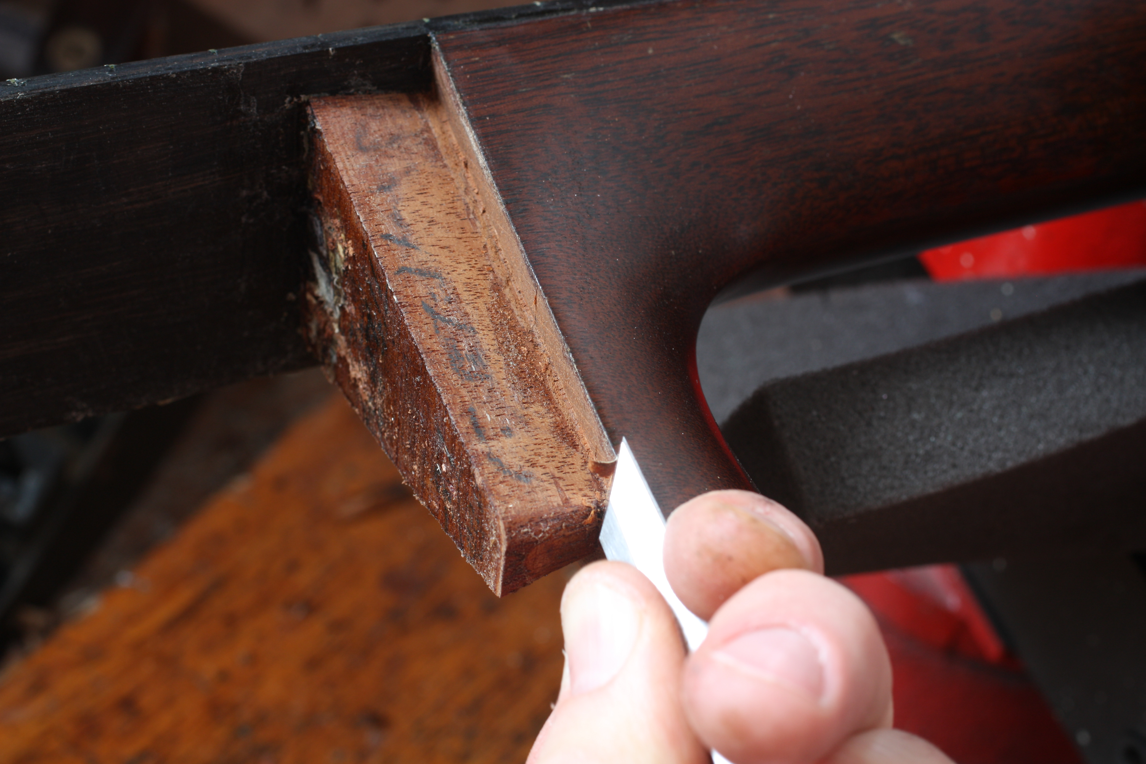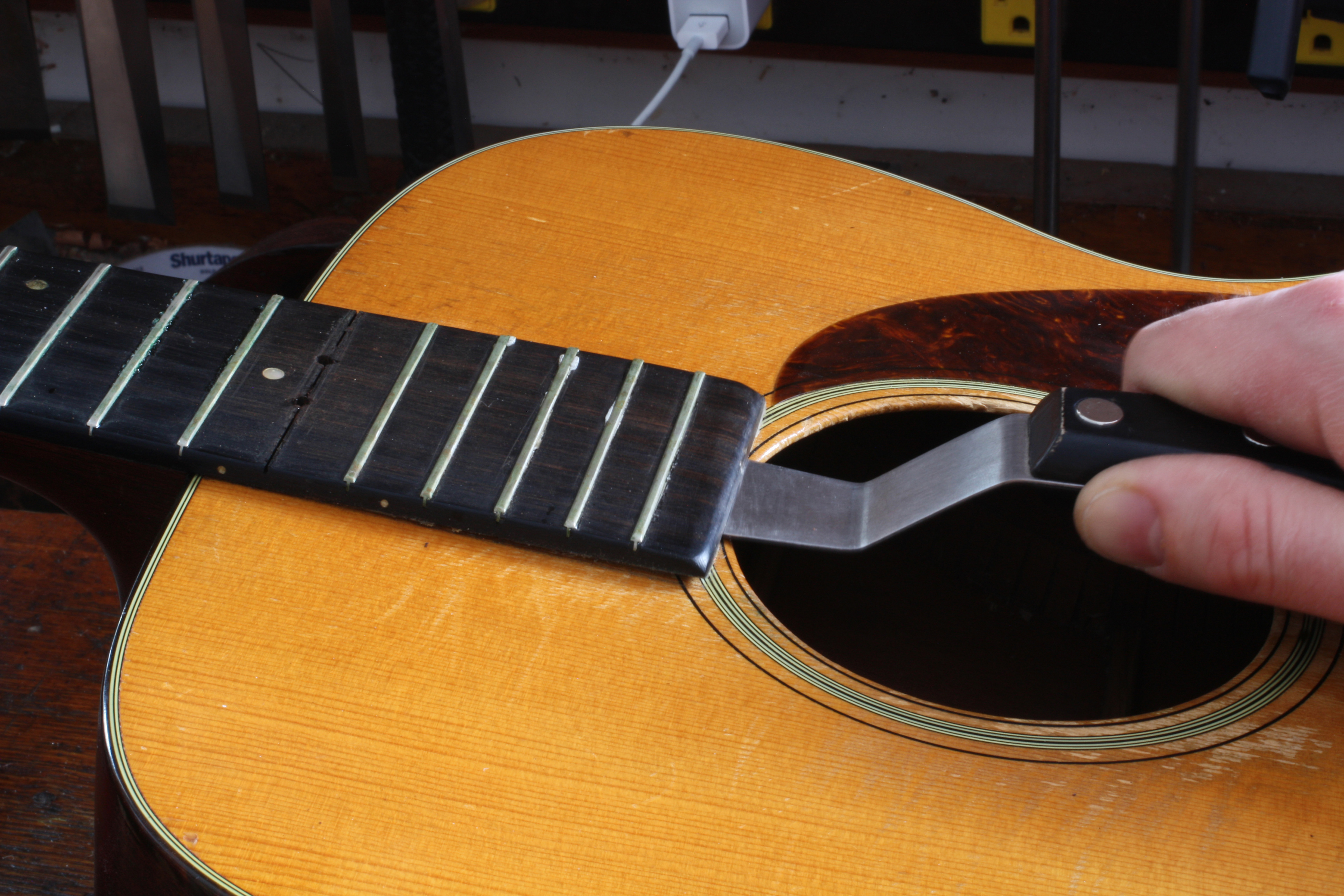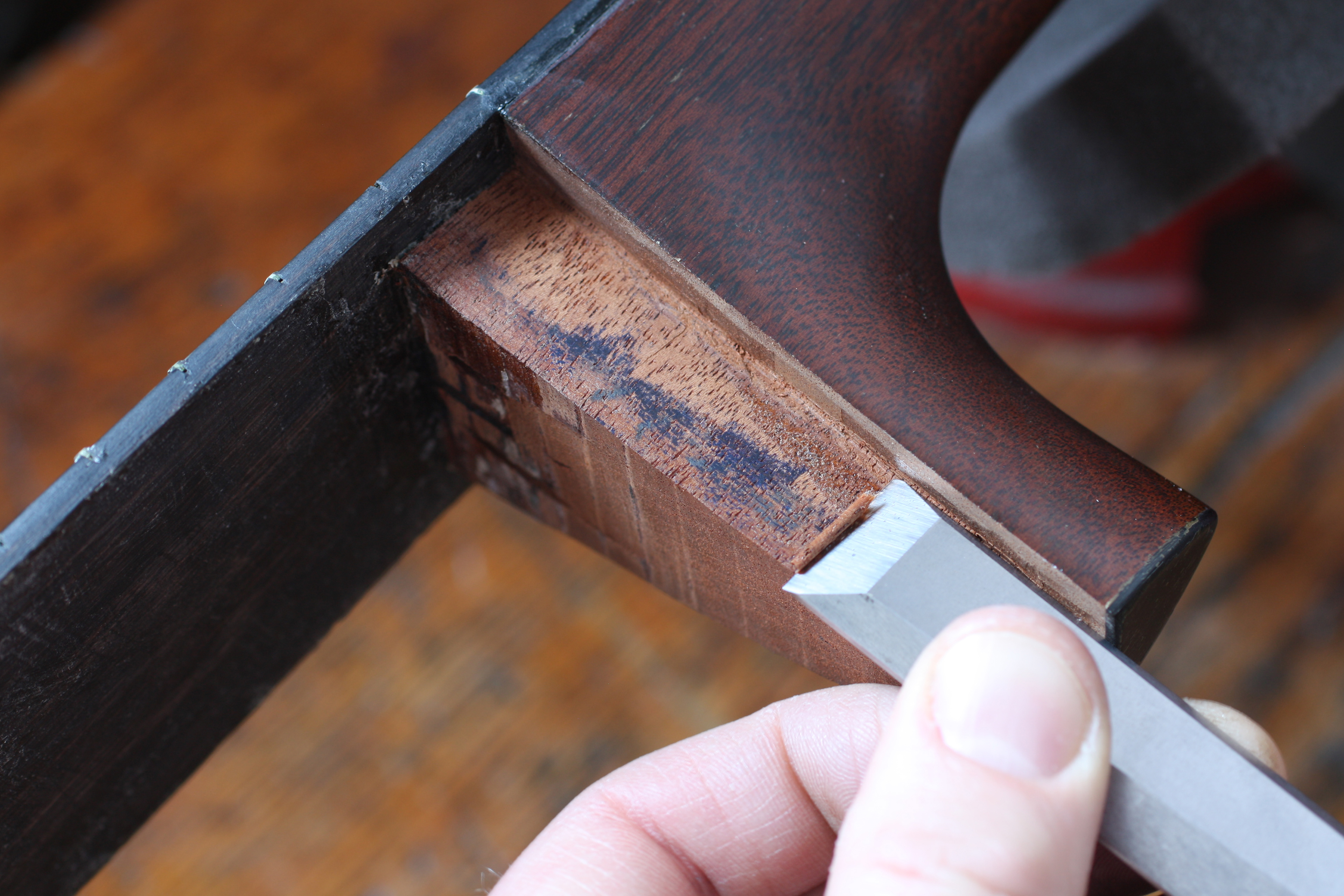 Trimming the shoulders of the dovetail joint reset the neck to a better angle which will make the guitar easy to play again.