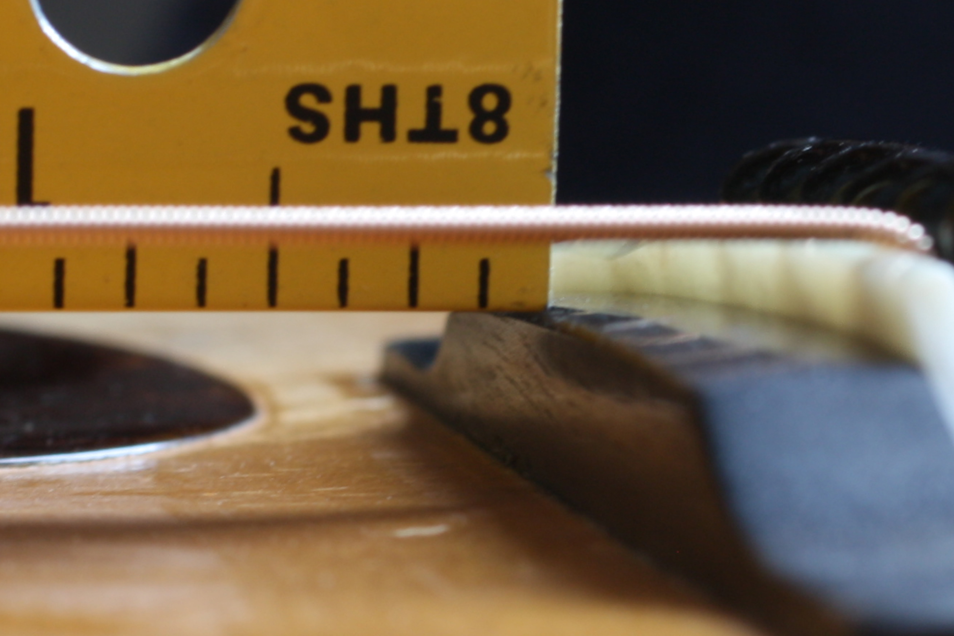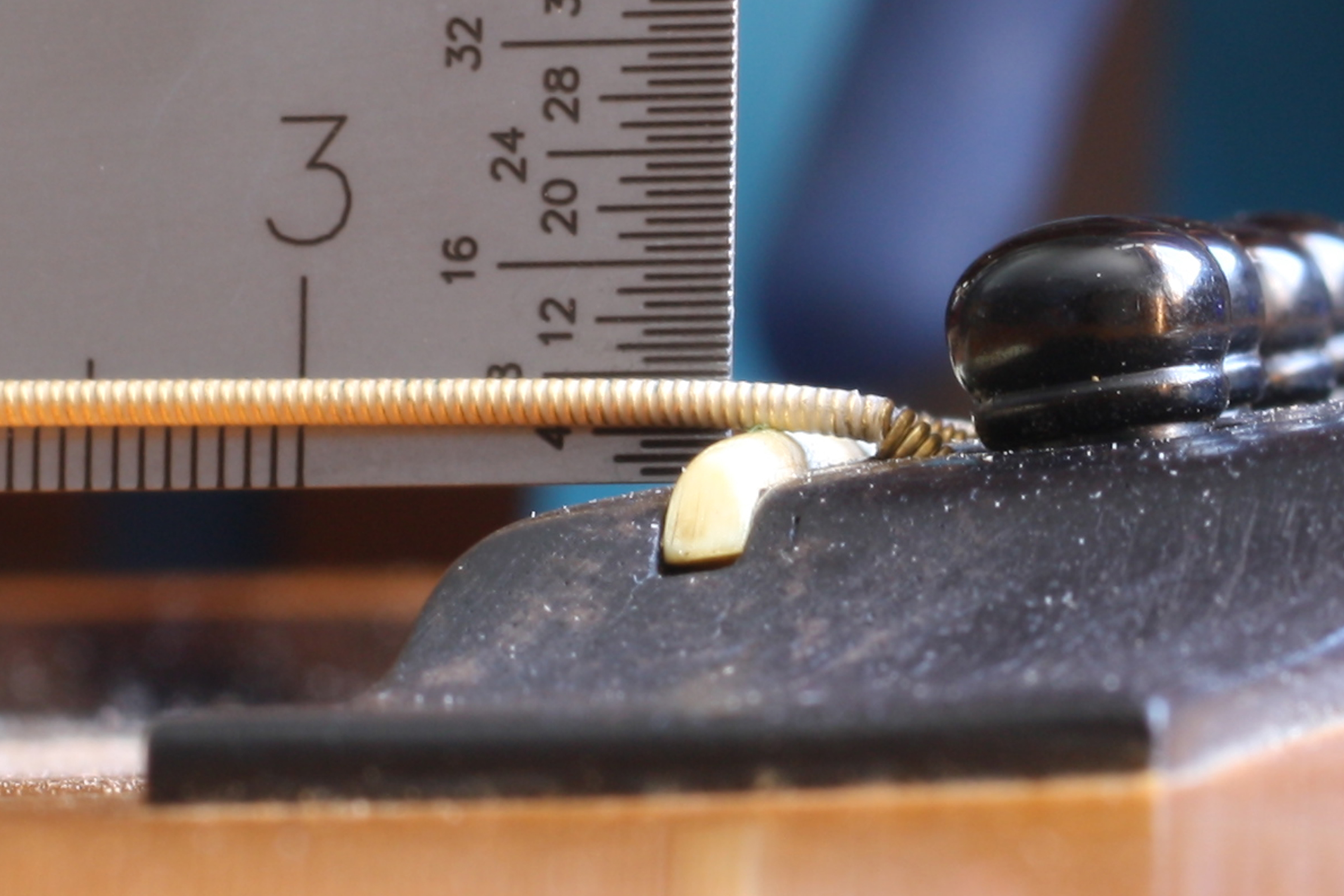 I've made a new, taller bone saddle which will improve the guitar's tone and projection. Because the neck angle has been reset the taller saddle won't make the action too high.