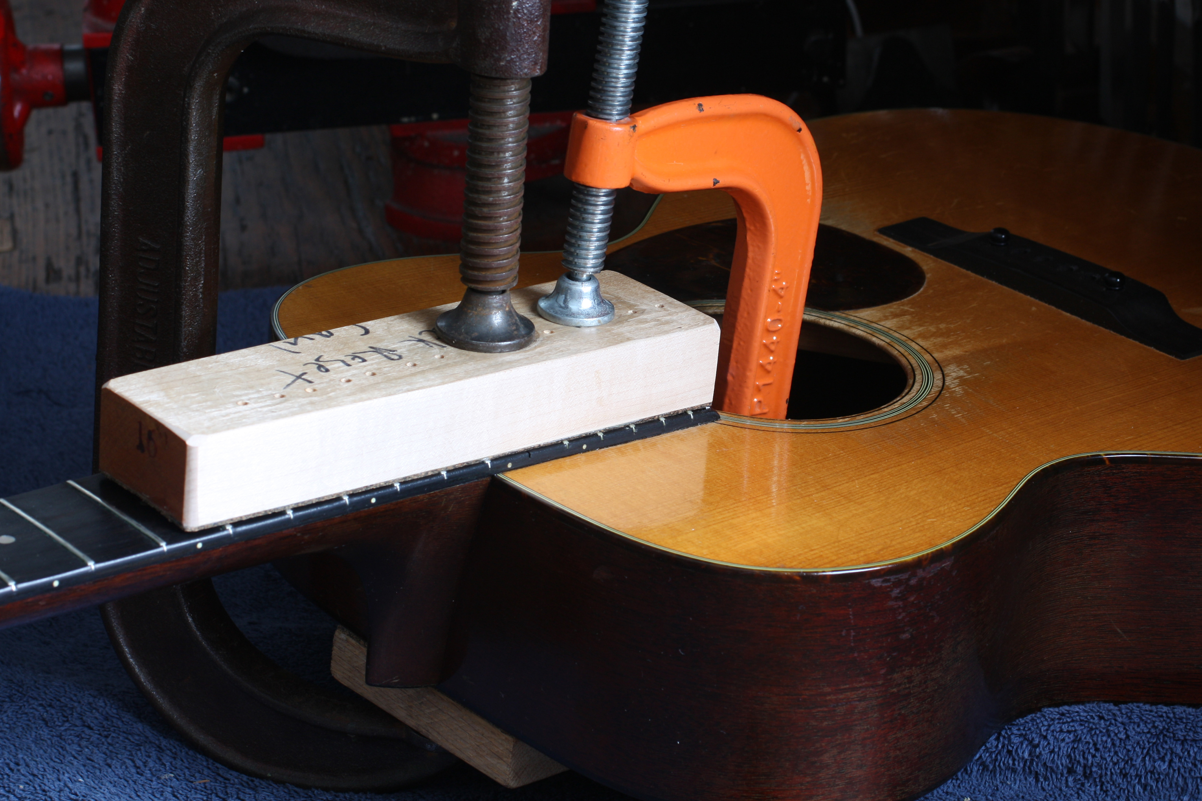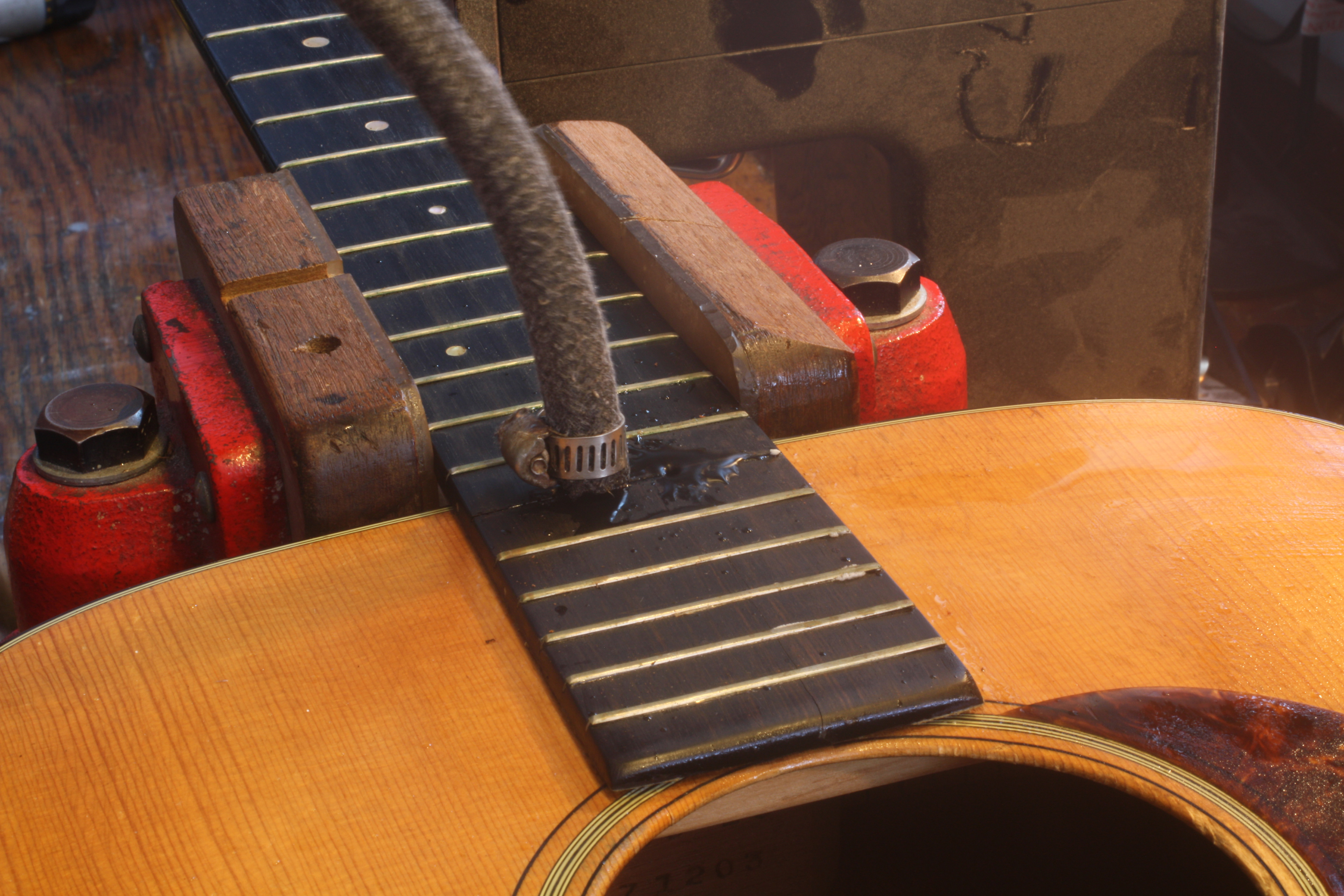 Gluing and clamping the neck to the guitar with hot hide glue, just like the factory used 70 or more years ago.