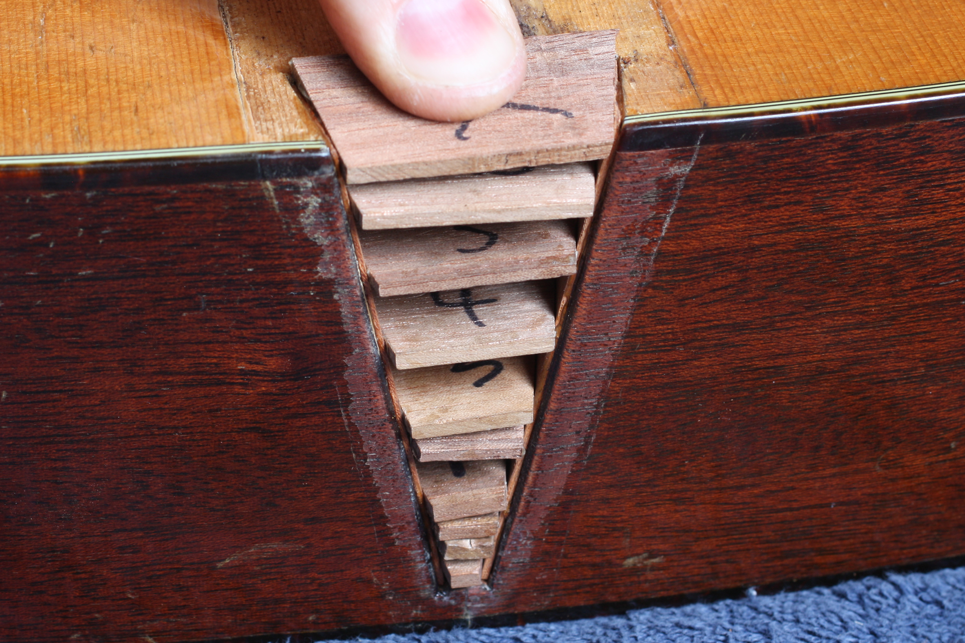 Refitting the dovetail joint. I pare the shims and the tenon alternately. Blue dental marking strips leave behind a blue color where the mortise and tenon are contacting one another. I'll carve away the blue marks and re-dry fit until the joint is nice and tight and the neck fully seats in the body of the guitar.