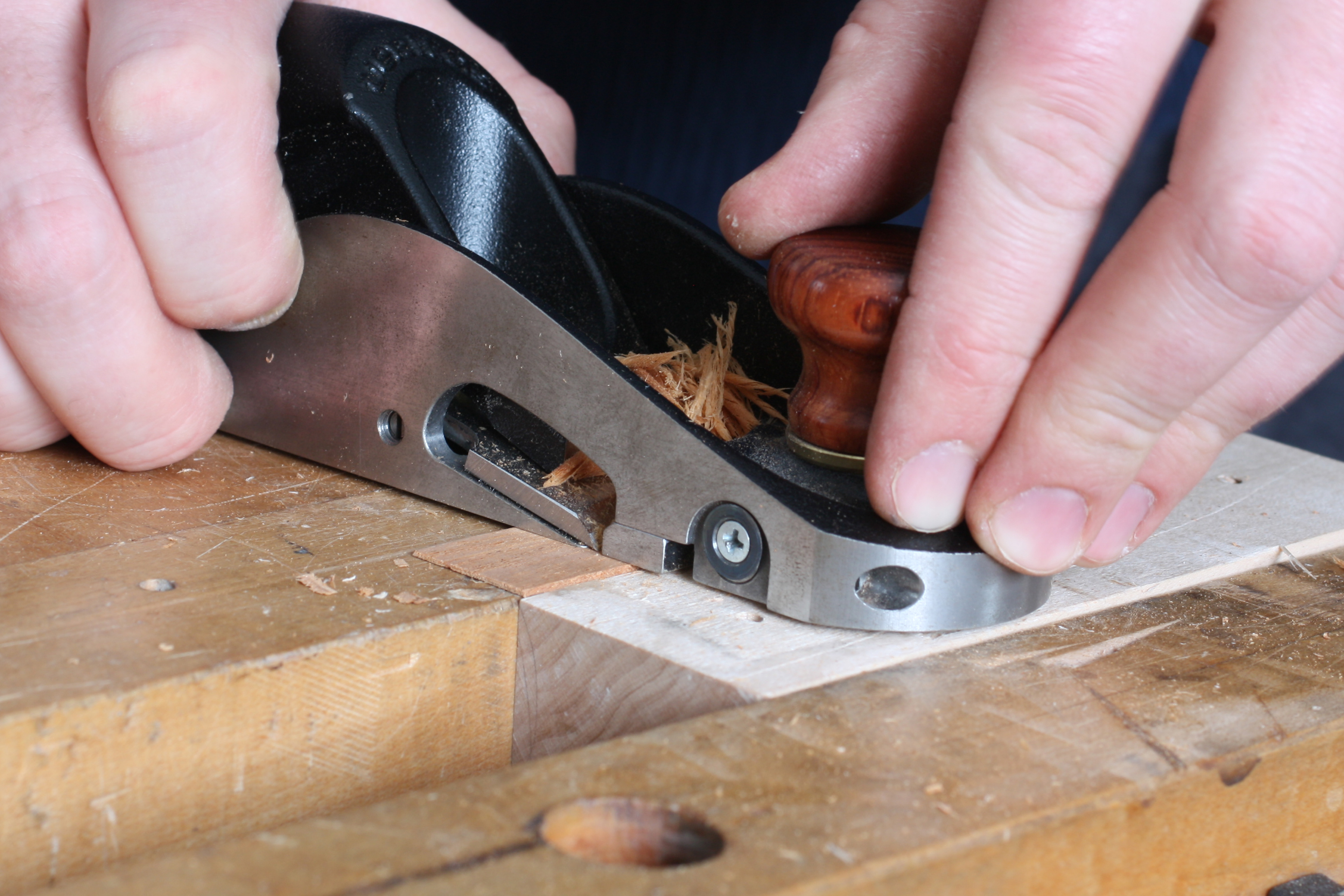 Making shims for the mortise/dovetail socket. Trimming the tenon shoulders makes the dovetail joint loose.