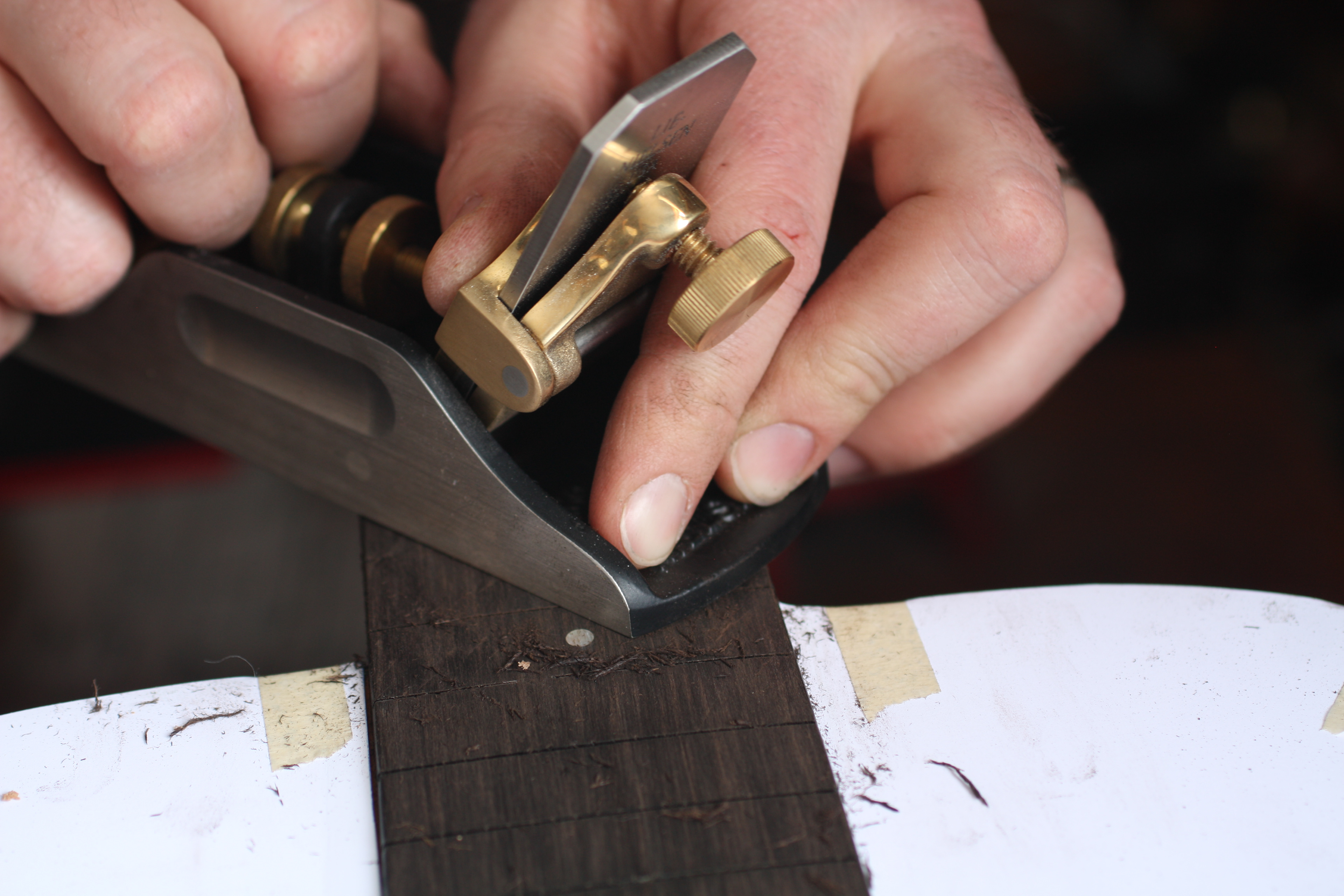 Truing the fretboard with a scraper plane. Most of the time I refret a guitar after I've reset the neck. Planing and sanding down any high spots in the neck is part of the refret process.