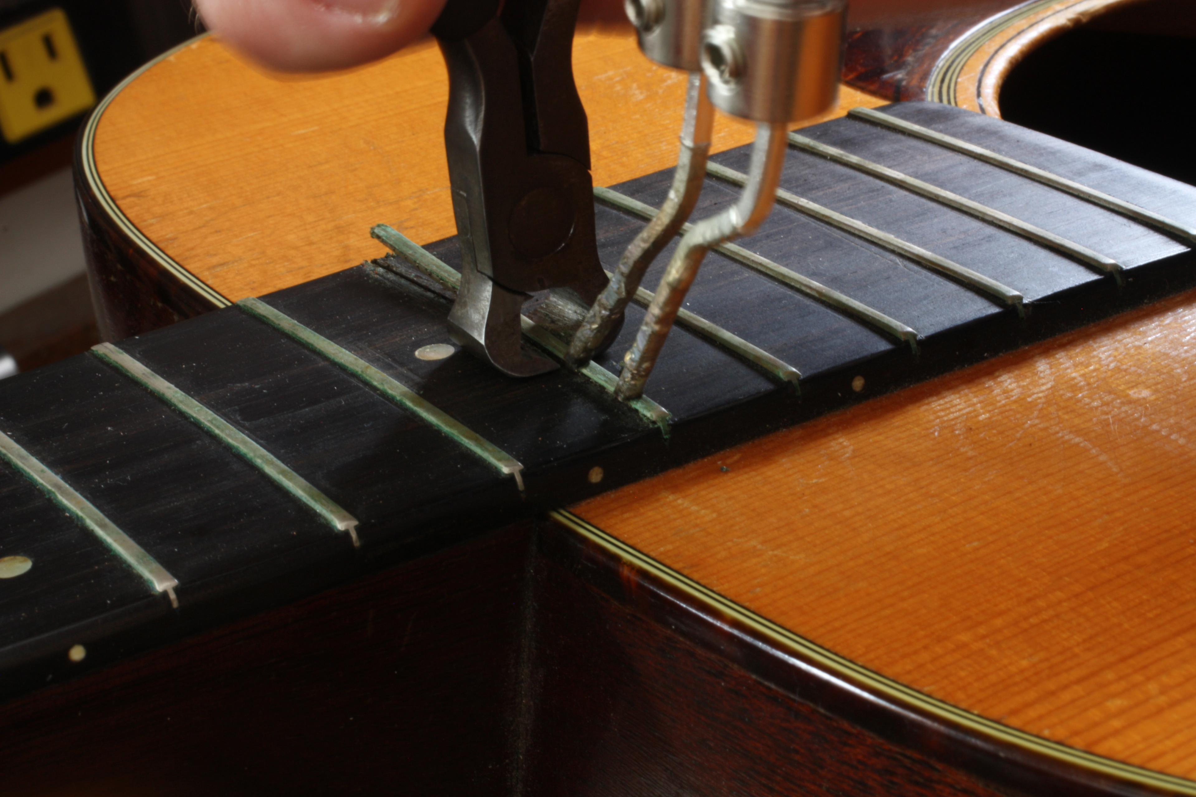 Removing the fret over the neck joint. A modified soldering gun and flush ground end nippers pull the fret without damaging the ebony fretboard.
