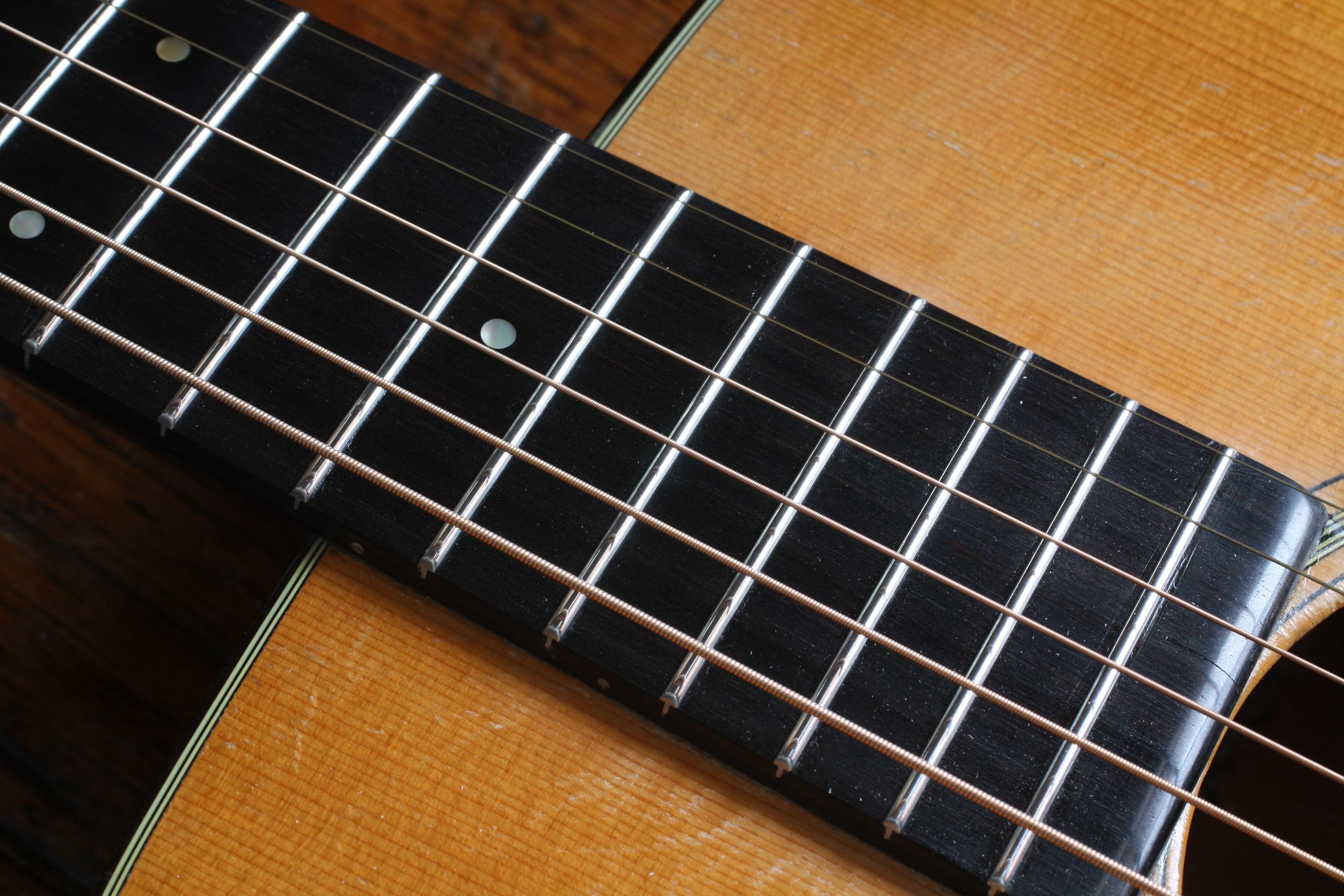 This old Martin guitar was built before the 2nd world war. The guitar is hard to play because the strings are high above the fretboard. This is called high action. Over time, the tension of the strings alters the geometry of the guitar, much like gravity will settle a house so that doors will stick or not open correctly.