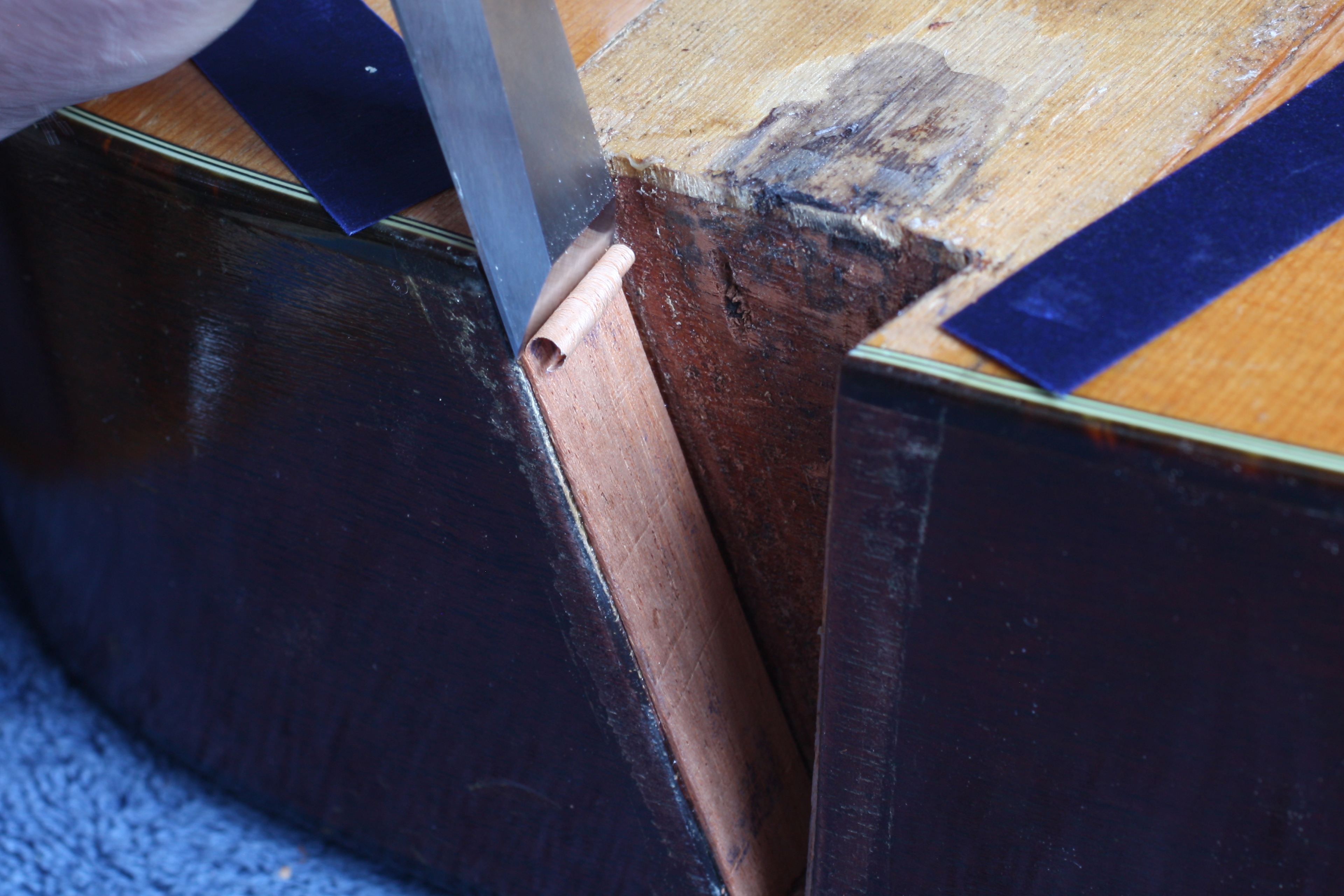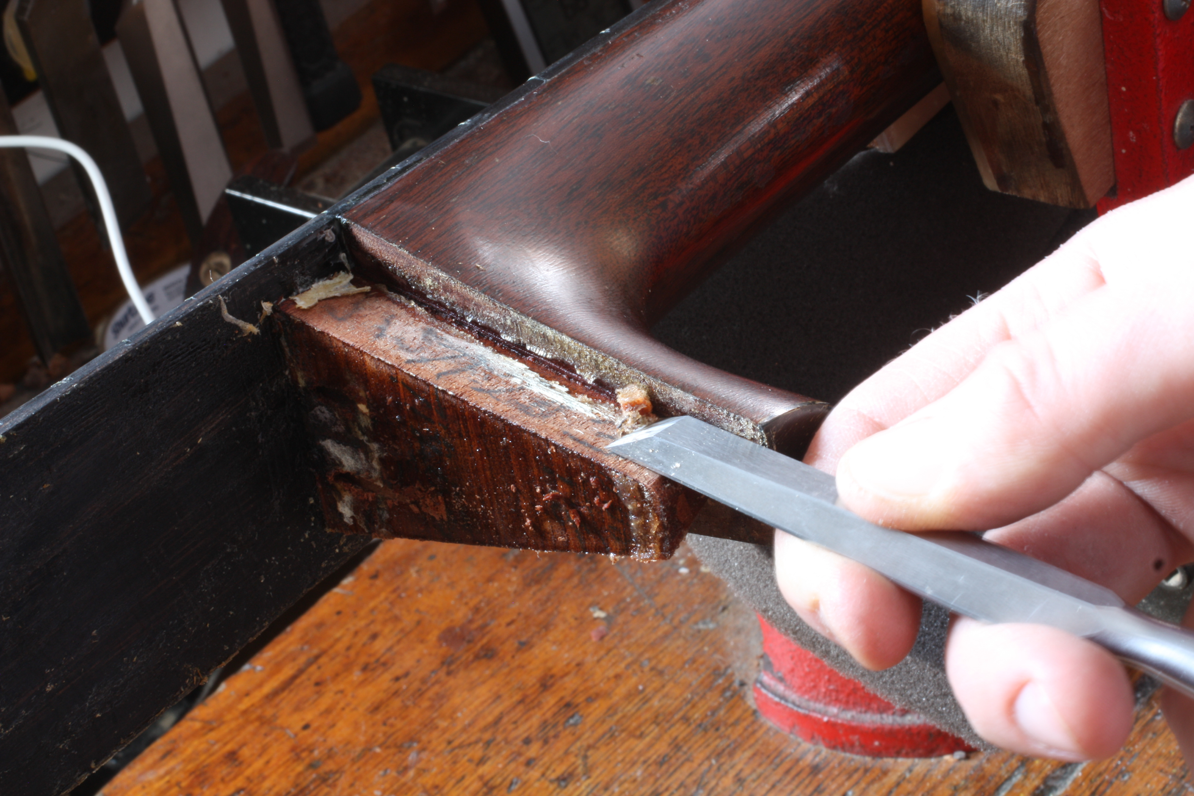 Carving away the old glue.