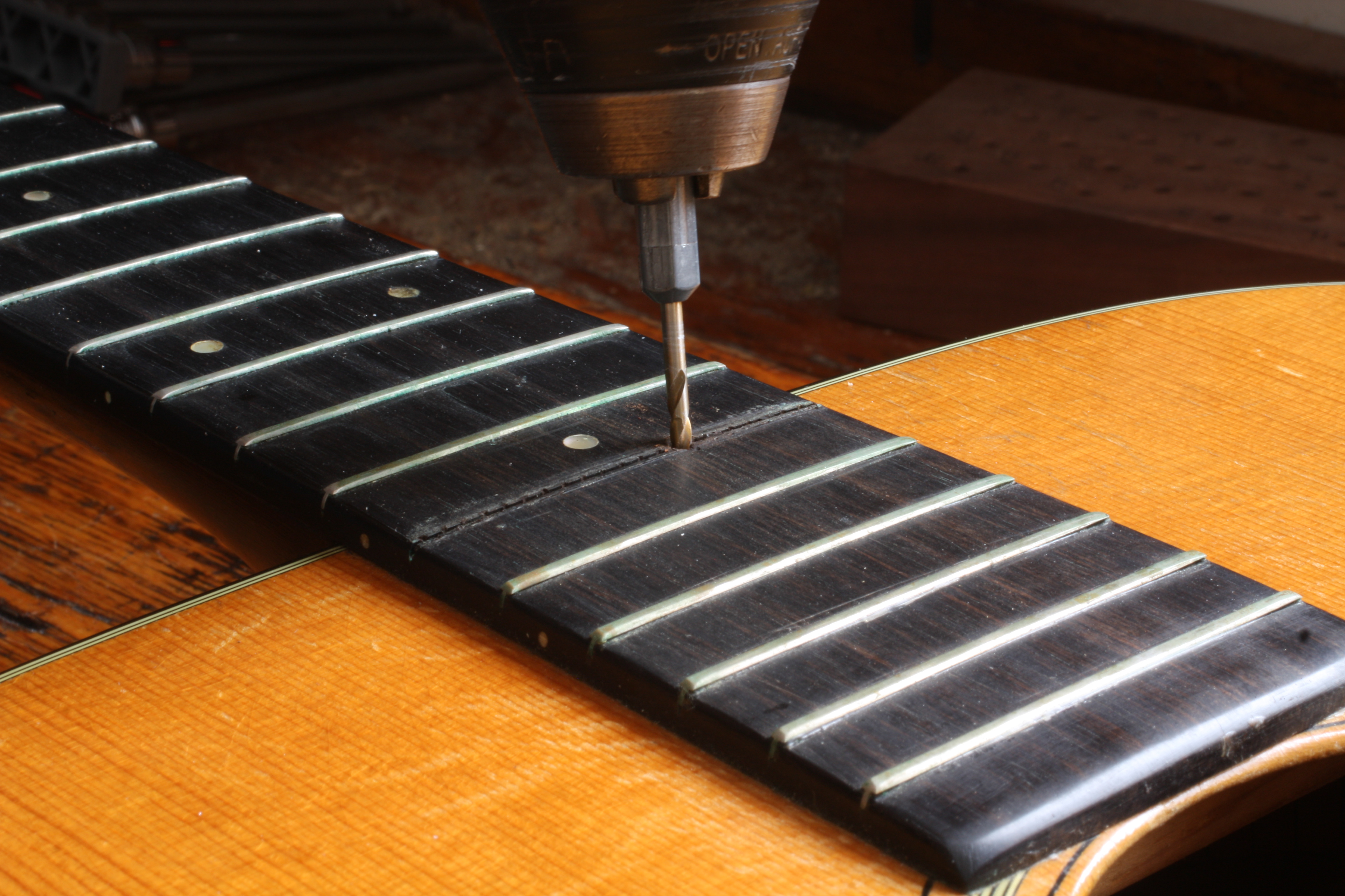 Drilling a hole through the fret slot into the back of the dovetail joint.